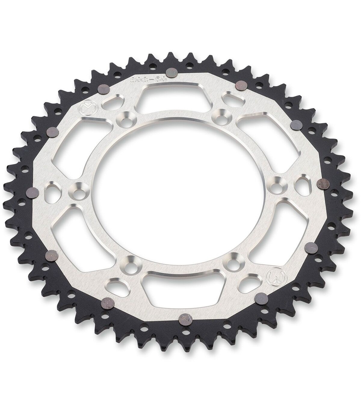 Dual Rear SprocketThe inner ring is made of aluminum 7075.T6 and the ring gear is made of high-performance steel.Self-cleaning dirt groove between each tooth prevents dirt accumulation.Longer life than standard aluminum sprockets and lighter than steel sprockets.
