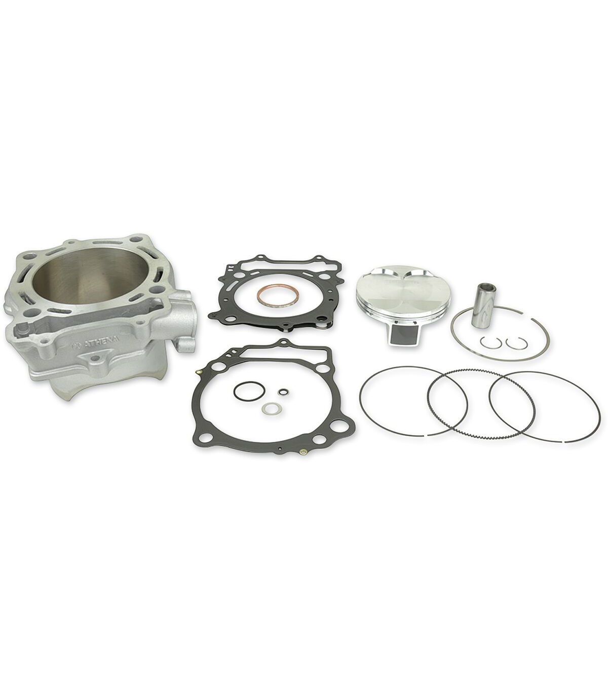 Cylinder Kit Stock Bore Race for 4 StrokeHigh performance, hard anodized power valves (cannot use OEM)Forged OEM-style domed piston kitAluminum cylinder with nickel-carbide coating, ported to Factory Works specsAthena top-end gasket set including required seals and hardwareKit does not include cylinder head.
