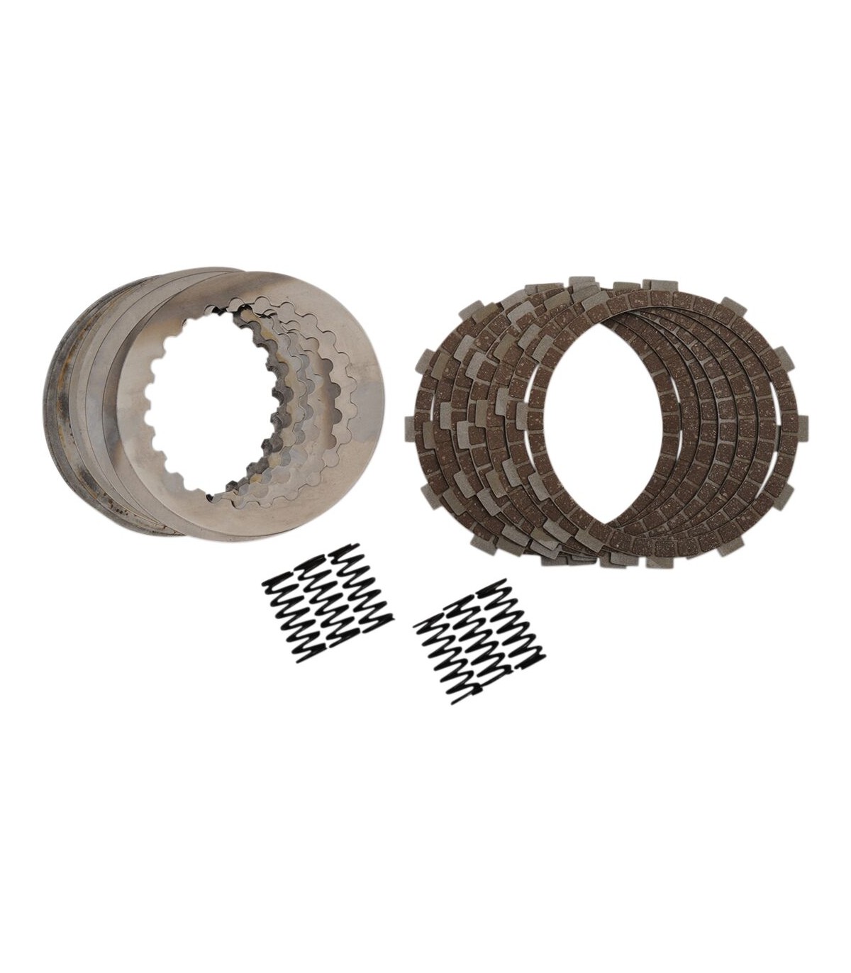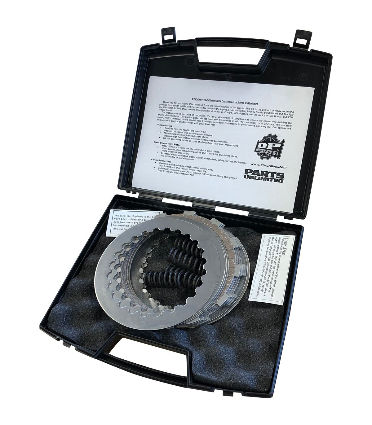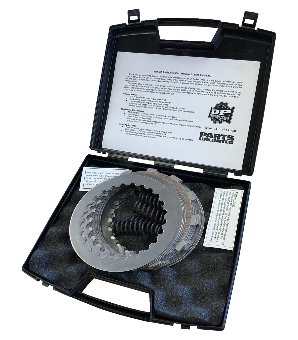 Kit d’embrayage DPKPerformances supérieures aux embrayages OEM ou aftermarketLes kits DPK comprennent des disques garnis, des disques d'embrayage lisses en acier et des ressortsLes kits DPK sont livrés dans une mallette en plastique avec une doublure en mousse protégeant les éléments d'embrayage contre les aléas des transports.Réutilisez la mallette pour transporter des pièces ou des outilsPrêt pour la course - pas besoin de tremper les disques dans l'huile.Excellente transmission de la puissanceMatériaux de friction exclusifs traités thermiquement pour des performances constantesAlliage adapté à la pratique tout-terrain et pour les motos Dual SportPlus durables que les disques OEMDISQUES D'EMBRAYAGE LISSES EN ACIERContrairement aux disques en aluminium d'origine, les disques lisses ne provoquent pas de déformation ou d'usure prématuréeLongue durée de vie – jusqu'à près de 300 % en plus par rapport aux disques d'origineDémarrage facilité grâce à l'augmentation de poids du volant moteur.Pas de pollution de l'huileRESSORTS D'EMBRAYAGEFil en chrome silicium usiné avec précisionTraitement thermique et grenaillage pour une durée de vie maximaleÉvite le patinage de l'embrayageAméliore l'embrayage et les sensations de passage de vitesse.