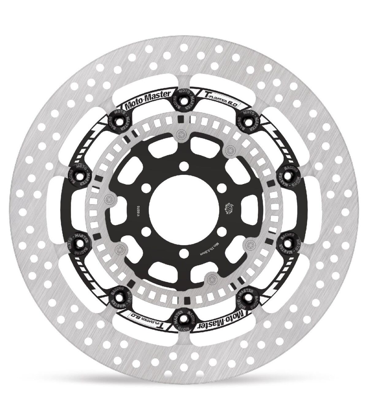 Disque de frein T-Floater série HALOLa conception de l'anneau extérieur HALO assure une dissipation régulière de la chaleur dans des conditions de stress thermique, tout en préservant la propreté de la surface de contact de la plaquette de frein.L'épaisseur de l'anneau extérieur est de 6,0 mm (320 mm) et comporte un trou de refroidissement supplémentaire sur le périmètre extérieur.La partie extérieure découpée au laser et meulée avec précision est fixée à un support en aluminium taillé dans la masse usiné CNC de qualité aéronautique qui est anodisé noir et marqué au laser.Le système T-Floater offre un comportement de flottement contrôlé précis même dans les conditions extrêmes de courseLe design sophistiqué T-Floater permet de résister à de grandes charges mécaniques et de réduire l'usure à un minimumLe système T-Floater est léger grâce à des flotteurs en aluminium anodisé dur spécialement conçus.Brake Rotor Halo T-Floater, Outside Diameter 320mm, Inner Diameter 64mm, Thickness 6,0mm, Pitch 80mm
