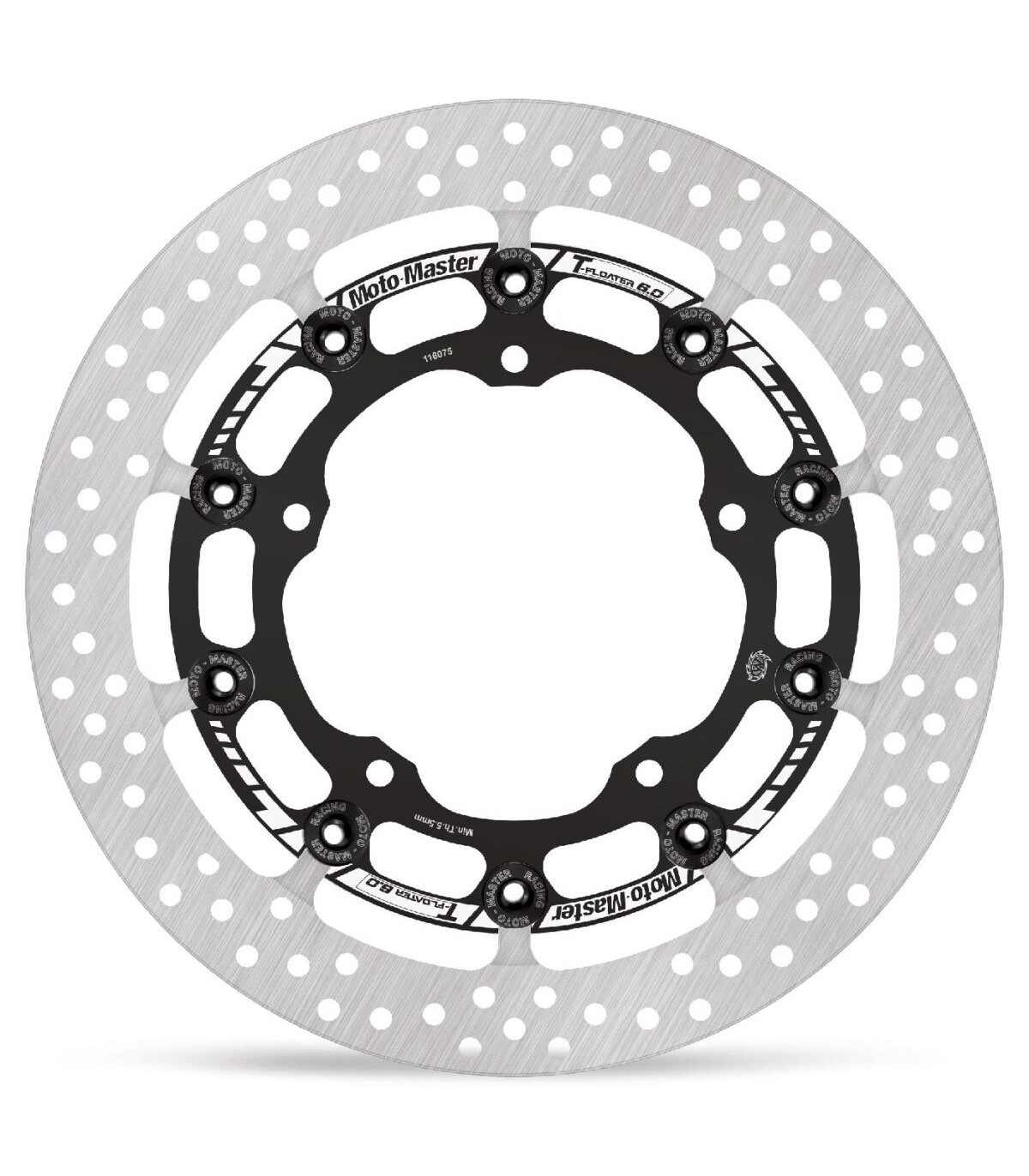 Disque de frein T-Floater série HALOLa conception de l'anneau extérieur HALO assure une dissipation régulière de la chaleur dans des conditions de stress thermique, tout en préservant la propreté de la surface de contact de la plaquette de frein.L'épaisseur de l'anneau extérieur est de 6,0 mm (320 mm) et comporte un trou de refroidissement supplémentaire sur le périmètre extérieur.La partie extérieure découpée au laser et meulée avec précision est fixée à un support en aluminium taillé dans la masse usiné CNC de qualité aéronautique qui est anodisé noir et marqué au laser.Le système T-Floater offre un comportement de flottement contrôlé précis même dans les conditions extrêmes de courseLe design sophistiqué T-Floater permet de résister à de grandes charges mécaniques et de réduire l'usure à un minimumLe système T-Floater est léger grâce à des flotteurs en aluminium anodisé dur spécialement conçus.Diamètre externe : 320 mm, diamètre interne : 132 mm, épaisseur : 6 mm