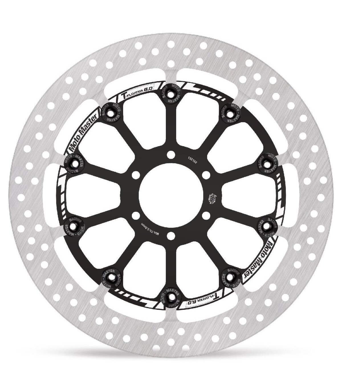 Disque de frein T-Floater série HALOLa conception de l'anneau extérieur HALO assure une dissipation régulière de la chaleur dans des conditions de stress thermique, tout en préservant la propreté de la surface de contact de la plaquette de frein.L'épaisseur de l'anneau extérieur est de 6,0 mm (320 mm) et comporte un trou de refroidissement supplémentaire sur le périmètre extérieur.La partie extérieure découpée au laser et meulée avec précision est fixée à un support en aluminium taillé dans la masse usiné CNC de qualité aéronautique qui est anodisé noir et marqué au laser.Le système T-Floater offre un comportement de flottement contrôlé précis même dans les conditions extrêmes de courseLe design sophistiqué T-Floater permet de résister à de grandes charges mécaniques et de réduire l'usure à un minimumLe système T-Floater est léger grâce à des flotteurs en aluminium anodisé dur spécialement conçus.Brake Rotor Halo T-Floater, Outside Diameter 320mm, Inner Diameter 64mm, Thickness 6,0mm, Pitch 80mm