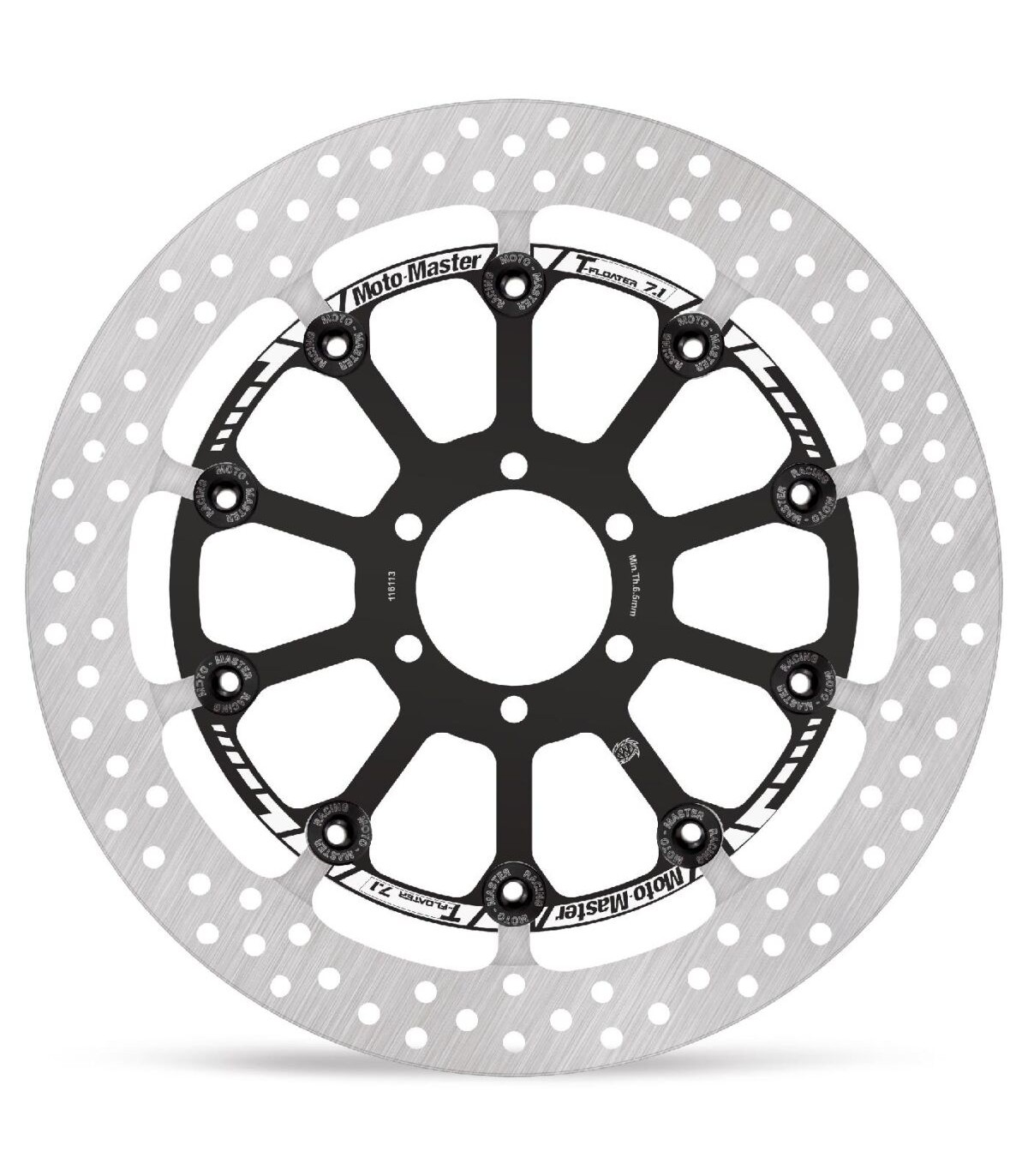 Disque de frein T-Floater série HALOLa conception de l'anneau extérieur HALO assure une dissipation régulière de la chaleur dans des conditions de stress thermique, tout en préservant la propreté de la surface de contact de la plaquette de frein.L'épaisseur de l'anneau extérieur est de 6,0 mm (320 mm) et comporte un trou de refroidissement supplémentaire sur le périmètre extérieur.La partie extérieure découpée au laser et meulée avec précision est fixée à un support en aluminium taillé dans la masse usiné CNC de qualité aéronautique qui est anodisé noir et marqué au laser.Le système T-Floater offre un comportement de flottement contrôlé précis même dans les conditions extrêmes de courseLe design sophistiqué T-Floater permet de résister à de grandes charges mécaniques et de réduire l'usure à un minimumLe système T-Floater est léger grâce à des flotteurs en aluminium anodisé dur spécialement conçus.Brake Rotor Halo T-Floater, Outside Diameter 321mm, Inner Diameter 64mm, Thickness 7,1mm, Pitch 80mm
