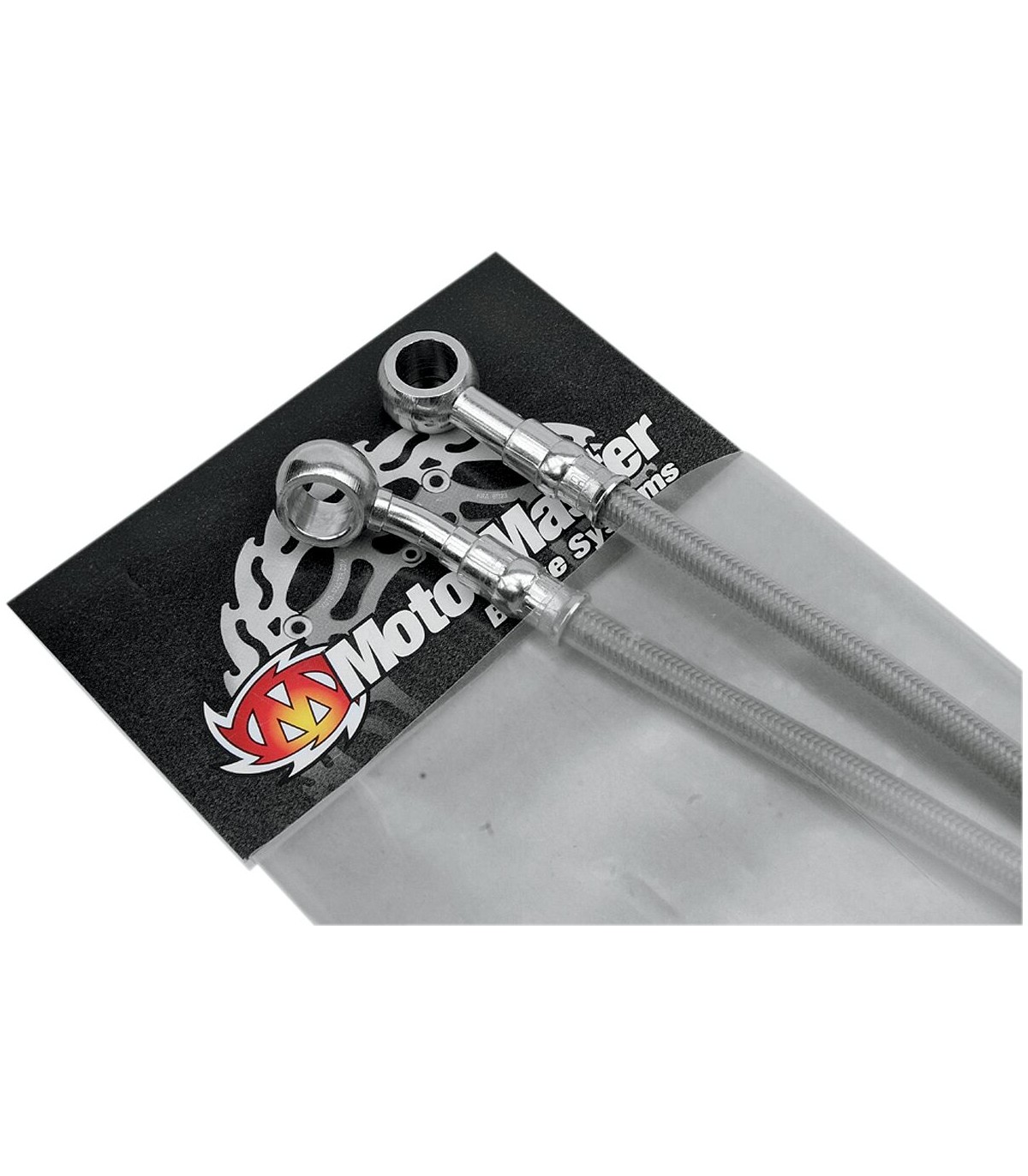 Durite de frein en acier inoxydableConçue spécialement pour une utilisation avec notre maître-cylindre radial, cette durite de frein en acier inoxydable tressé est une amélioration considérable pour tous les systèmes de freinsProtégée par un cache en PVC léger, mais durable qui lui permet de résister aux charges importantes et fournissant également de meilleures sensations et une incroyable réponse en raison de sa flexibilité réduite par rapport à la durite en plastique d'origine standardToutes les durites sont livrées avec le kit de montage nécessaire, y compris les vis Banjo et des rondelles en cuivre ainsi que les instructions d'installationPour motos sans pharesCes durites de frein DOIVENT être utilisées avec le maître-cylindre radial Moto Master réf. N° 0611-0026 et 0611-0027. Les durites de frein d'origine ne conviendront pas.