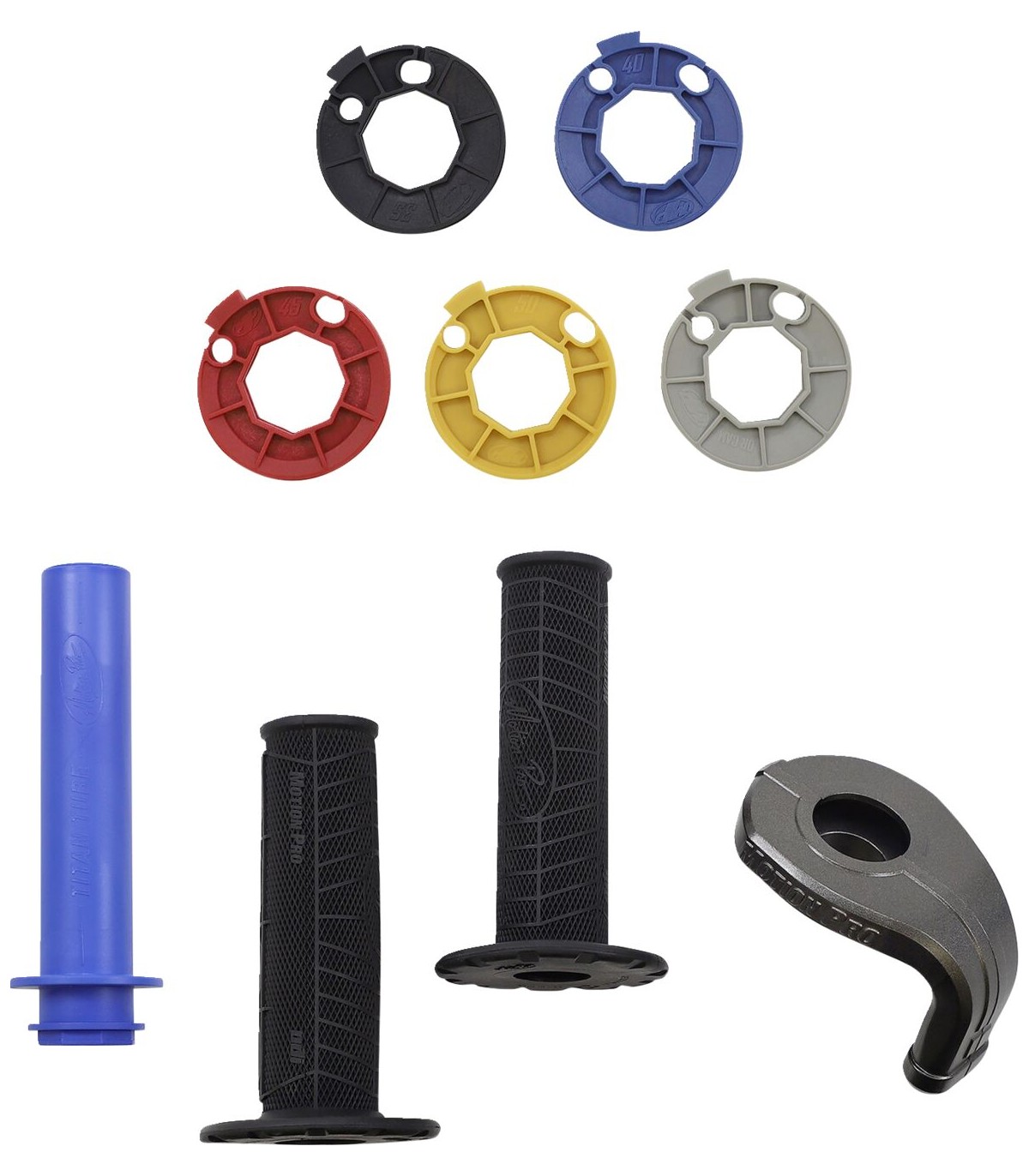 Rev3 Variable Rate Throttle KitSlim REV3™ throttle housing allows more room for lever clearance and adjustment to throttle housing positionInnovative reel changing system lets you tailor the throttle rate to your preference and riding conditionsFive different reels provide perfect throttle response for any condition: Use smaller reels for slower throttle rate and larger reels for faster throttle rate; included cam reel provides progressive throttle response preferred by some ridersCable boot keeps dirt and dust out for reliable and smooth operationImproved throttle stop provides greater strength and durability - Snap together elbows makes it even easier to install and change reelsREV3™ off-road kits are compatible with Motion Pro DirtControl™ V2 Lock-On grips and ODI Lock-On gripsBillet aluminum inline cable adjusters ease installation and adjustmentLower section of cables use 5 mm housing with PTFE liner for reduced friction, increased routing flexibility and lighter weightSimple to install and maintainUpper section of cables use 6 mm housing to provide solid support of adjustersPatentedRev3 Kits have cables specifically designed for fitment on specific models, but the Rev3 throttle itself is not model specific. Therefore, in some situations, the Rev3 kit may not be a direct bolt on installation due to space limitations on the stock handlebar. In some installations, it may be necessary to move other control components on the stock handlebar, shorten the Rev3 throttle tube and grip, install longer after market handlebars, or possibly all of the above. It is up to the end user to determine the best method for fitment on their motorcycle, and ensure that the Rev3 kit is installed properly and with the correct clearances for safe operation. Installation should be done by a qualified mechanic and carefully checked for proper function. Warning: Improper installation could result in great bodily injury or death.