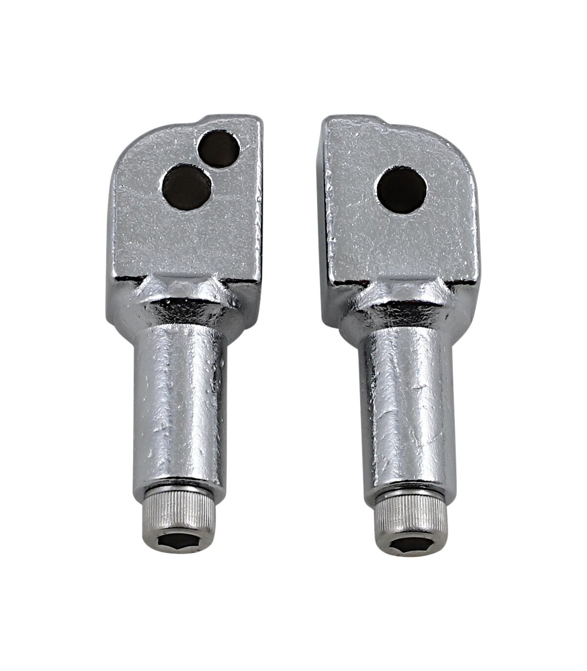 Male Clevis MountsConstructed of investment-cast 4130 chromoly steel for strengthFeature a threaded interface to make adjusting the angle of foot pegs easyConical surface creates a tension fit inside the foot peg when the 5/16-18 Allen cap screw is tightened inside the clevis, which holds the peg in placeThe clevises fasten to the 2-pronged mount with the stock pivot pin assembly, or you can use 3/8-inch bolts and nuts to secure the complete peg assembly to your machine