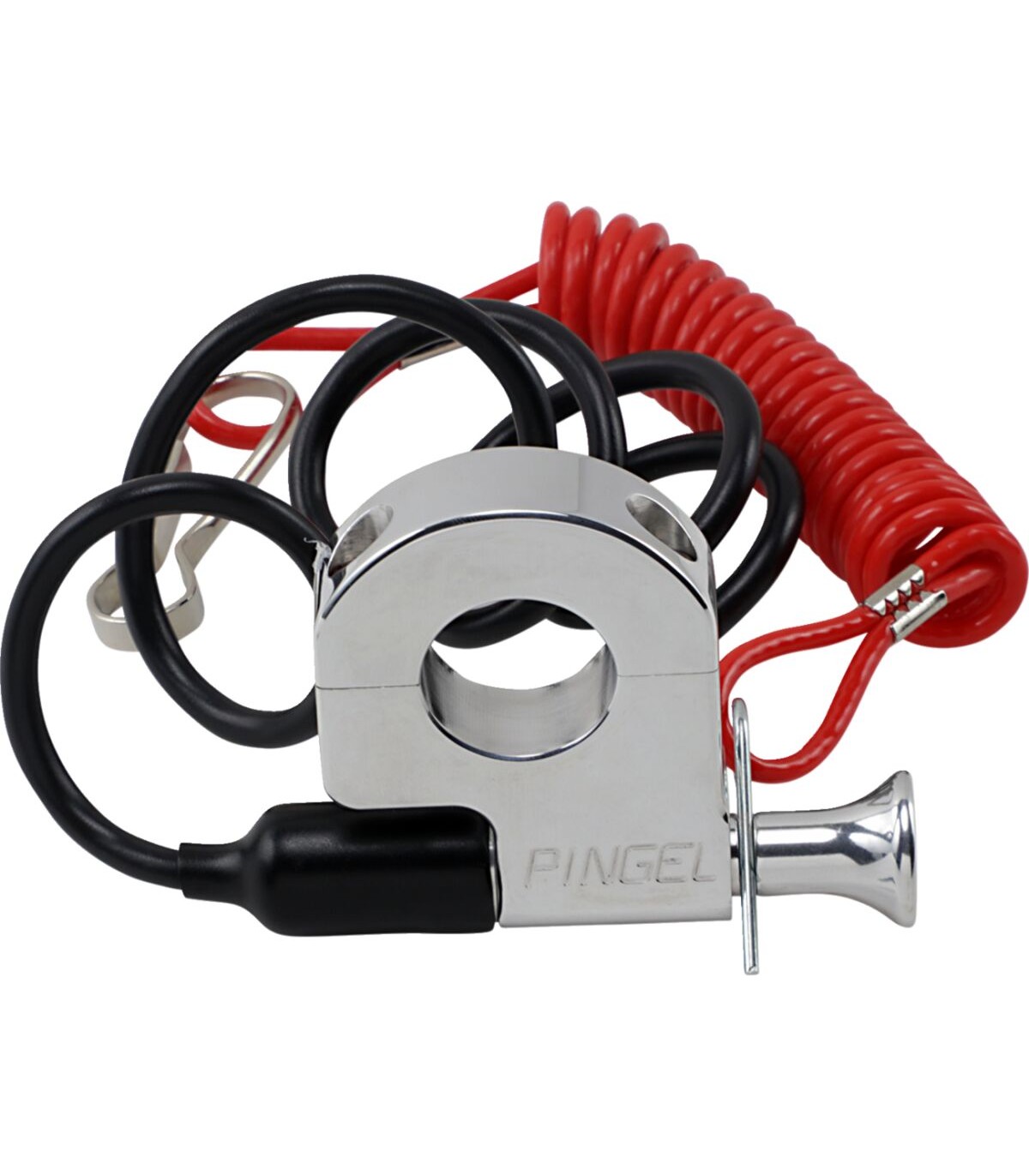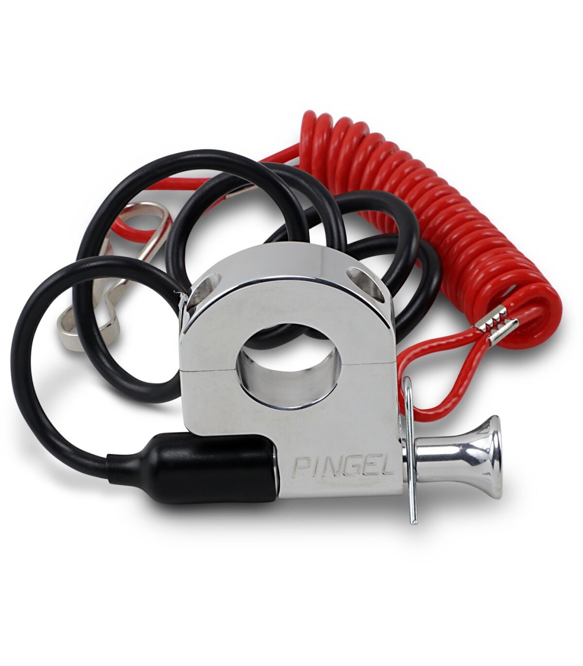 Cordon coupe-circuitLe coupe-circuit avec cordon à fixation sur le guidon protège votre moteur coûteux contre les risques de surrégimeAvec un cordon attaché extensible jusqu’à 50”Le cordon optionnel facile à fixer peut servir de bandeau de poignet ajustable à scratch et peut être accroché par-dessus les gantsFixation autour du guidon à deux pièces ; disponible pour les guidons de 7/8” ou 11/8”Fabrication en billette d’aluminium avec composants internes en acier inoxydable résistants à l’eauFabrication aux États-Unis