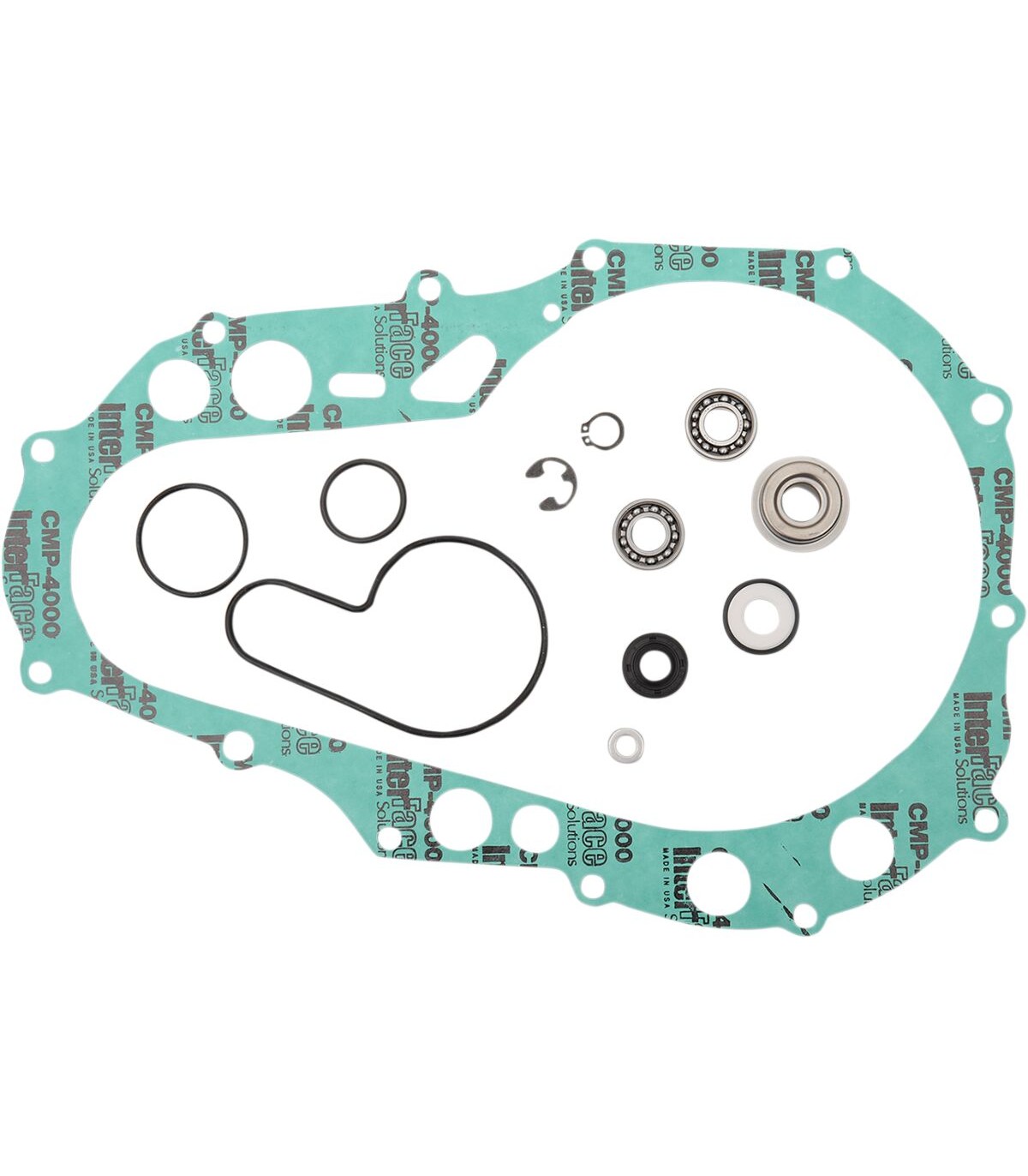 Kit réparation pompe à eauRenferme tous les joints, joints toriques, roulements et joints spy nécessaires pour réparer une pompe à eauLe kit contient les éléments suivants : roulements le cas échéant, joints en caoutchouc, joint de pompe à eau mécanique le cas échéant, joint de carter latéral, joint de pompe à eau, circlips sur l’axe de pompe à eau et joints de vidange en cuivre.