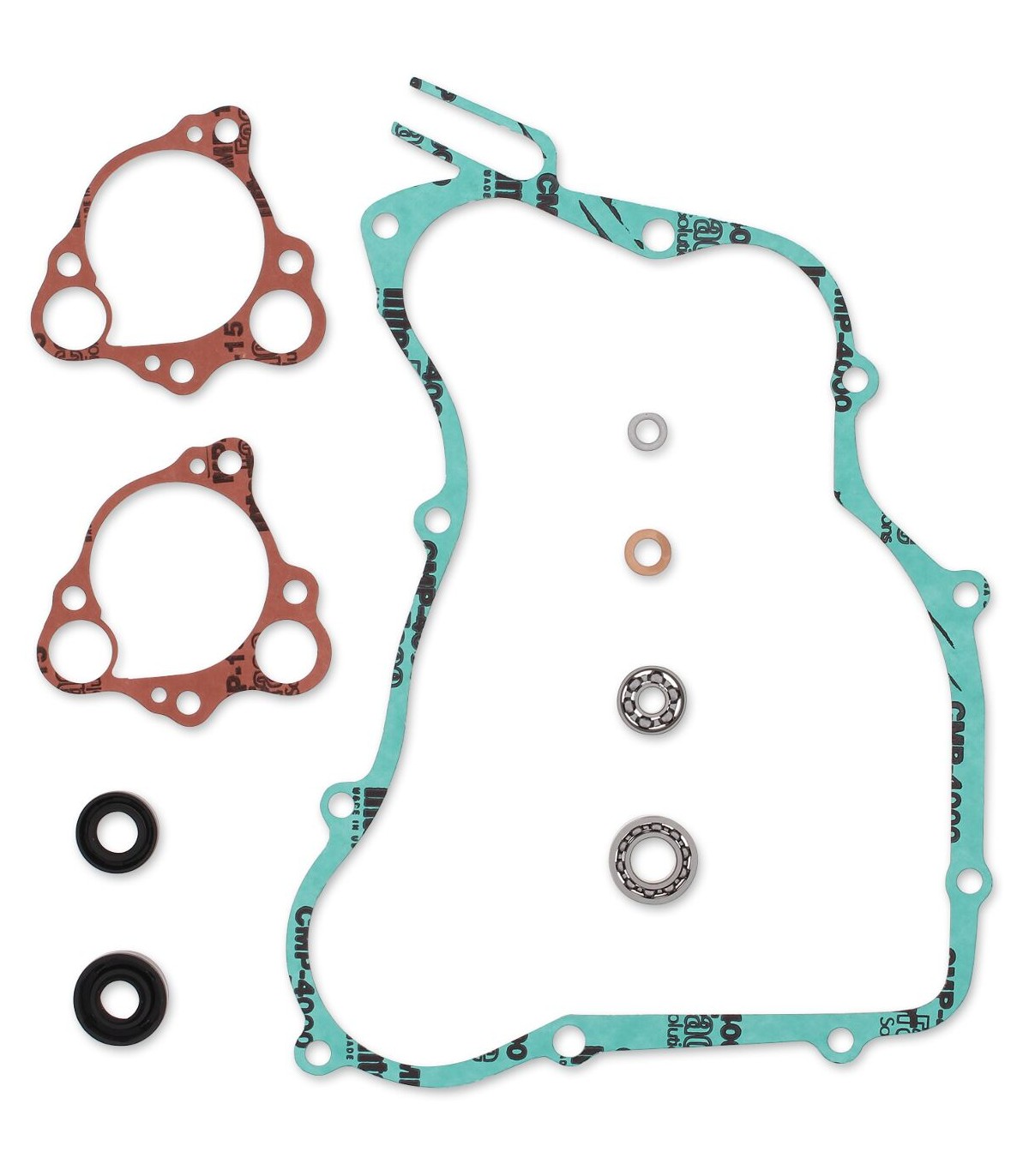 Kit réparation pompe à eauRenferme tous les joints, joints toriques, roulements et joints spy nécessaires pour réparer une pompe à eauLe kit contient les éléments suivants : roulements le cas échéant, joints en caoutchouc, joint de pompe à eau mécanique le cas échéant, joint de carter latéral, joint de pompe à eau, circlips sur l’axe de pompe à eau et joints de vidange en cuivre.