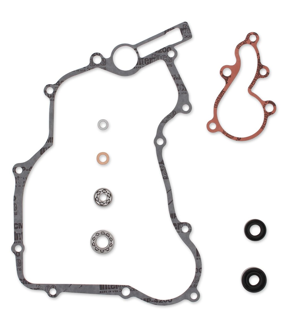 Kit réparation pompe à eauRenferme tous les joints, joints toriques, roulements et joints spy nécessaires pour réparer une pompe à eauLe kit contient les éléments suivants : roulements le cas échéant, joints en caoutchouc, joint de pompe à eau mécanique le cas échéant, joint de carter latéral, joint de pompe à eau, circlips sur l’axe de pompe à eau et joints de vidange en cuivre.
