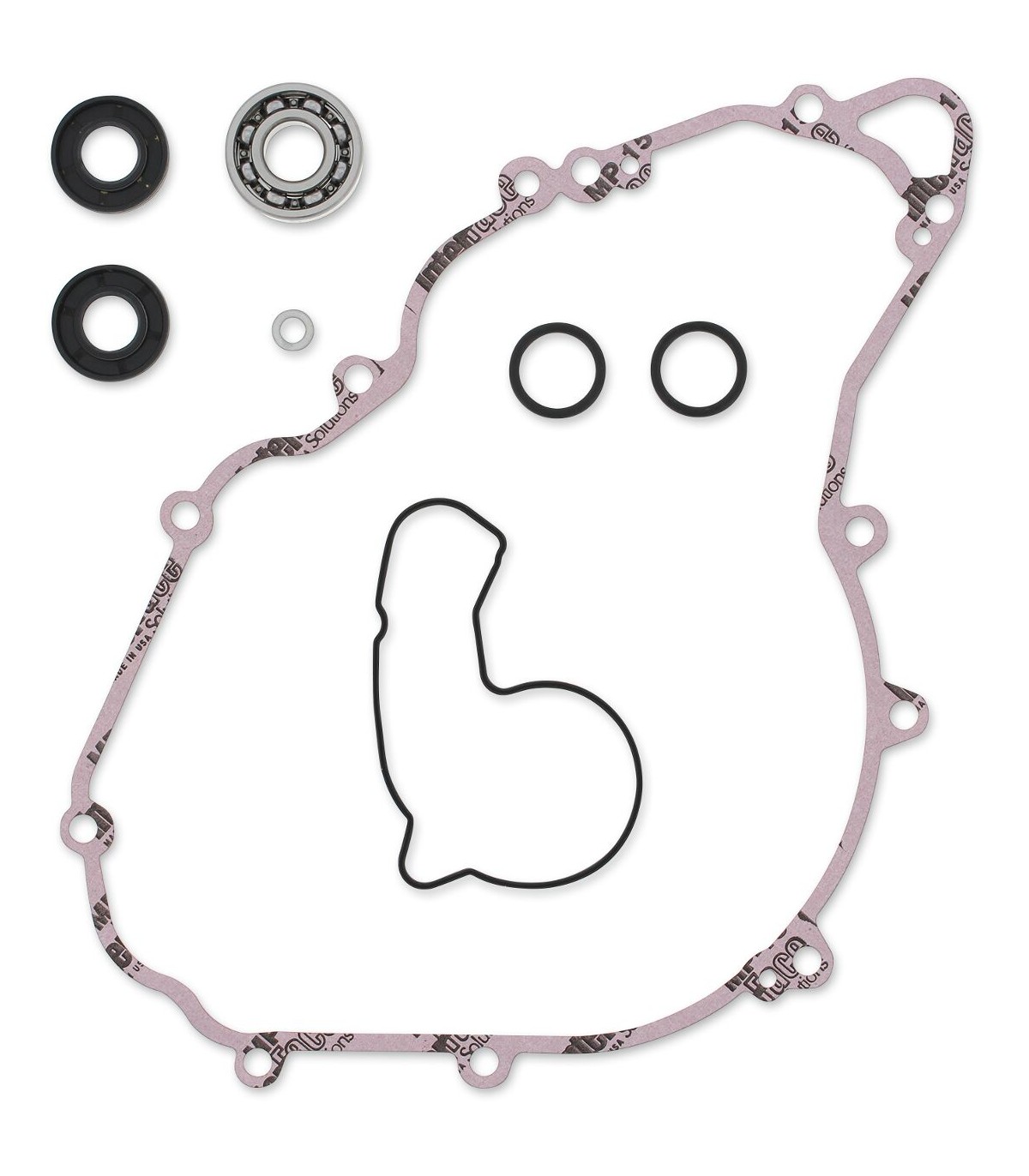 Kit réparation pompe à eauRenferme tous les joints, joints toriques, roulements et joints spy nécessaires pour réparer une pompe à eauLe kit contient les éléments suivants : roulements le cas échéant, joints en caoutchouc, joint de pompe à eau mécanique le cas échéant, joint de carter latéral, joint de pompe à eau, circlips sur l’axe de pompe à eau et joints de vidange en cuivre.