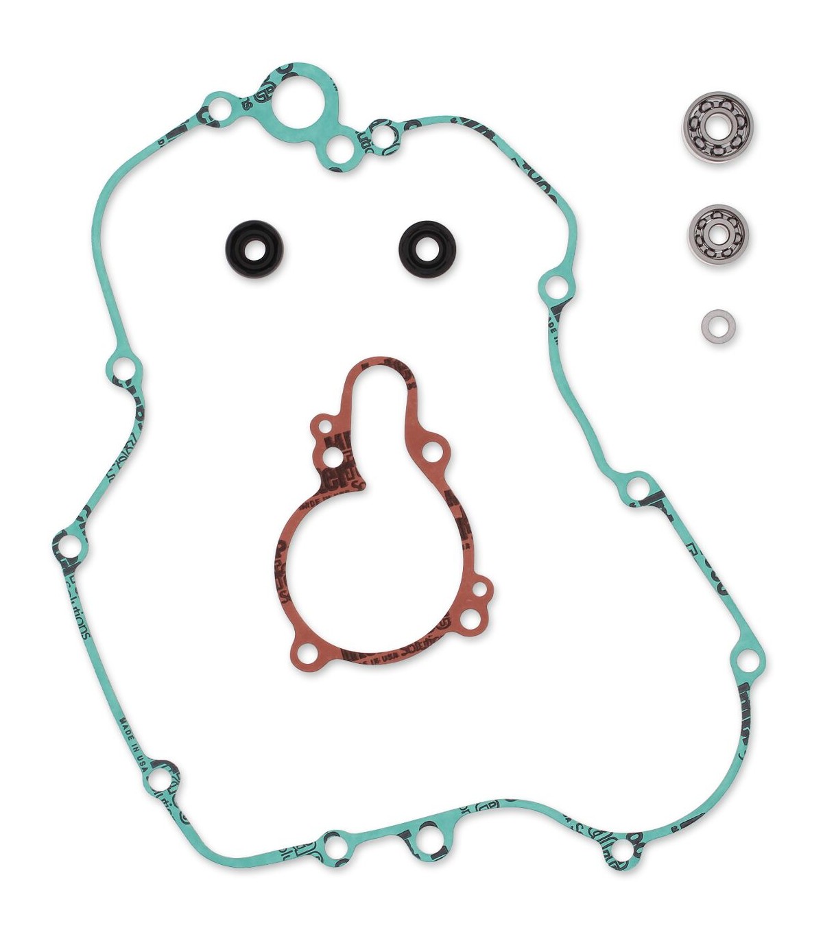 Kit réparation pompe à eauRenferme tous les joints, joints toriques, roulements et joints spy nécessaires pour réparer une pompe à eauLe kit contient les éléments suivants : roulements le cas échéant, joints en caoutchouc, joint de pompe à eau mécanique le cas échéant, joint de carter latéral, joint de pompe à eau, circlips sur l’axe de pompe à eau et joints de vidange en cuivre.