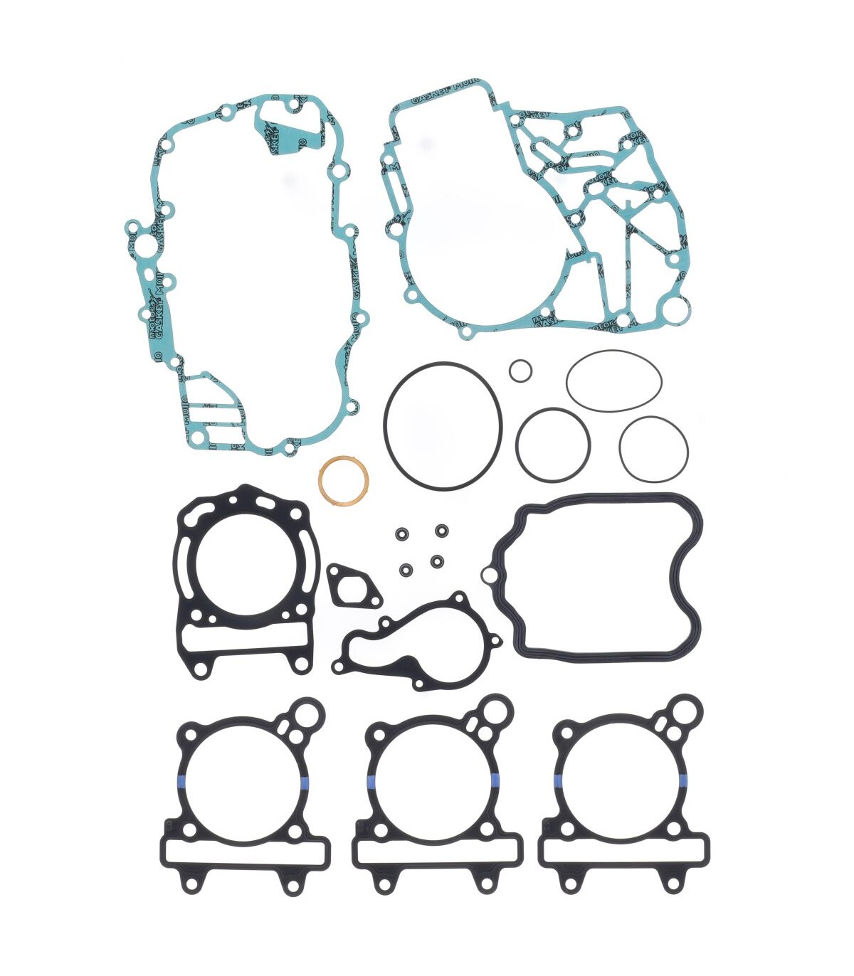 Kits de joints completKit de joints de qualité supérieure fabriqués par Athena S.p.A.Joints de culasse caractérisés par une structure ondulable en acier revêtu de caoutchoucLes joints d’embase en acier doux sont revêtus de caoutchoucLes matériaux de base en métal se caractérisent par une haute compression et une résistance à la tension supérieureLa couverture transparente révolutionnaire garantit une étanchéité parfaite même à des températures extrêmement élevéesCouche de silicone bleue de haute température sur la plupart de joints plats essentielsLes kits de joints complets comprennent tous les joints nécessaires pour reconstruire le joint haut et la partie inférieure du moteur, y compris tous les joints en caoutchouc et les joints toriques, partie supérieure et inférieure.