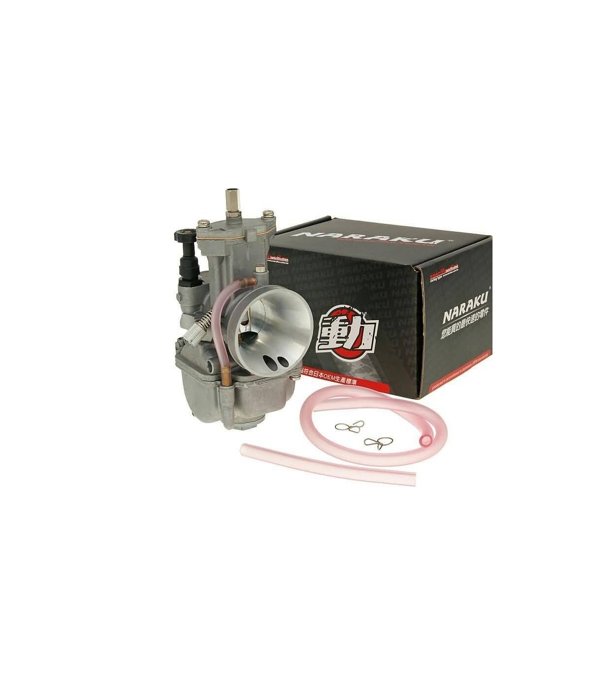 Racing CarburetorAmongst others our product range includes original replacement and sports carburetors, carburetor jets and intake manifolds.Combining a racing cylinder with a larger carburetor would best answer the ultimate goal: HIGHER SPEED! As a general rule a larger carb helps to improve cylinder filling level, thereby leading to higher rev and finally ending up in increased top speed.In order to get smooth driving characteristics, any change on your scooter requires carburetor adjustments.Naraku Racing V.2 flat slide carburettor for scooter, quad and other with 70cc 2-stroke cylinder. Also suitable for 125-300cc 4-stroke vehicles. Intake manifold connection: 35mm, Air filter connection: 50mm