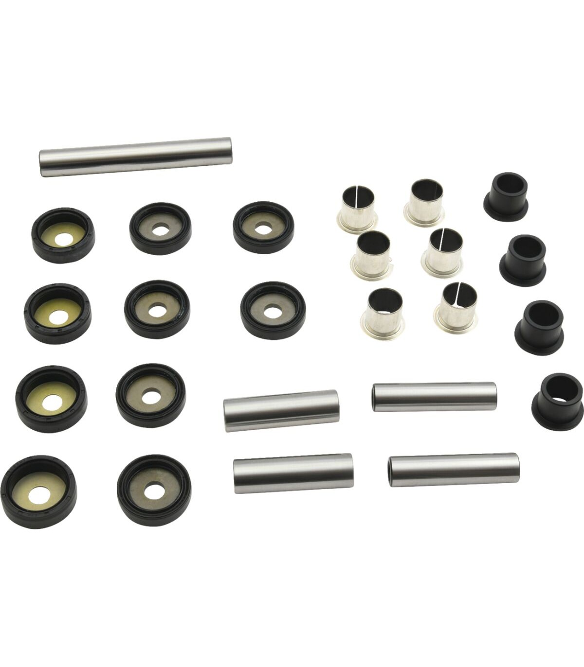 Kit d’amortisseur arrière indépendantKit rentable qui contient l’ensemble des roulements, des bagues, des joints, des entretoises et des autres composants nécessaires pour réparer les triangles de suspension de l’arrière (inférieur et supérieur), ainsi que l’articulationDeux kits nécessaires par véhicule