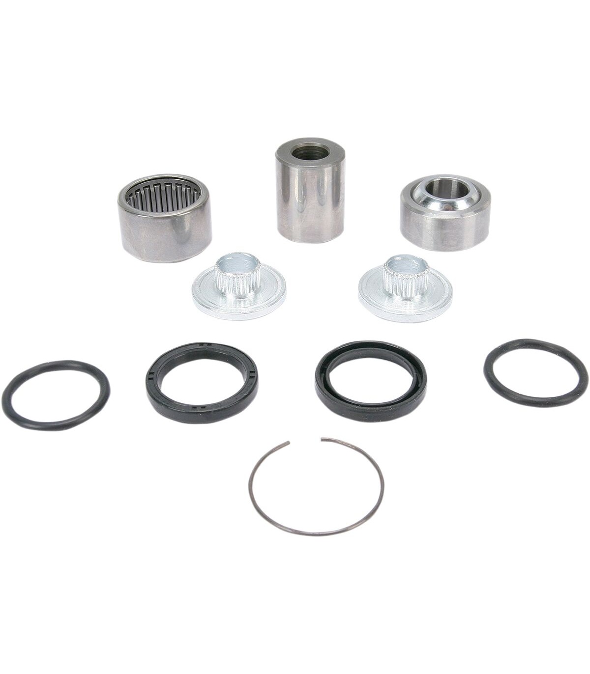 Shock Bearing KitKit contains two PTFE spherical bearings (cup bearings when used), four seals and related componentsEach shock kit rebuilds both ends of the shock absorberSome shock absorbers on Kawasaki and Honda models use a clevis to connect shock to the linkage. The bearing, collar and seals that are pressed into the linkage arm are included in the Pivot Works Shock Kit.