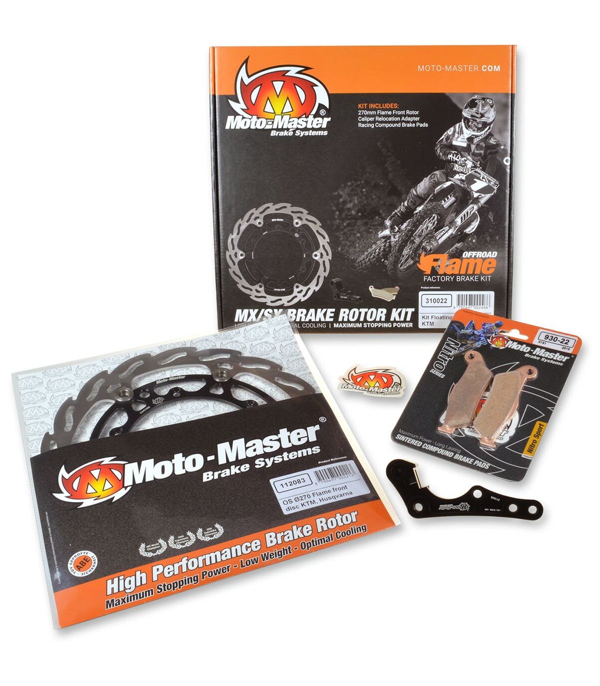 Kit de freins à disque flottant Flame surdimensionné 270 mmDisque flottant surdimensionné avant MX avec support anodisé noir marqué au laser léger en acier inoxydable et disque Flame inoxydable d'un diamètre de 270 mmAdaptateur de déport d'étrier assorti en billette d'aluminium aéronautique usiné CNC, anodisé noir et marqué au laserUn kit de frein avant très puissant et contrôlable, en particulier lorsqu'il est utilisé combiné à nos plaquettes de frein composées RacingLe kit surdimensionné le plus fréquemment utilisé avec le Racing MXGPLe kit contient : un disque de frein surdimensionné de 270 mm, un adaptateur de repositionnement d'étrier et un kit de plaquettes de frein avant composées Racing Moto Master Nitro SportOffre une amélioration des performances de 35 % par rapport à la version d'origineLe design léger offre un gain de poids de 20 %Le design Flame offre un refroidissement optimal et un freinage souple et plus prévisible, vous permettant de freiner plus fortHUSQVARNA FE 450 (Brembo caliper) 2014-2017