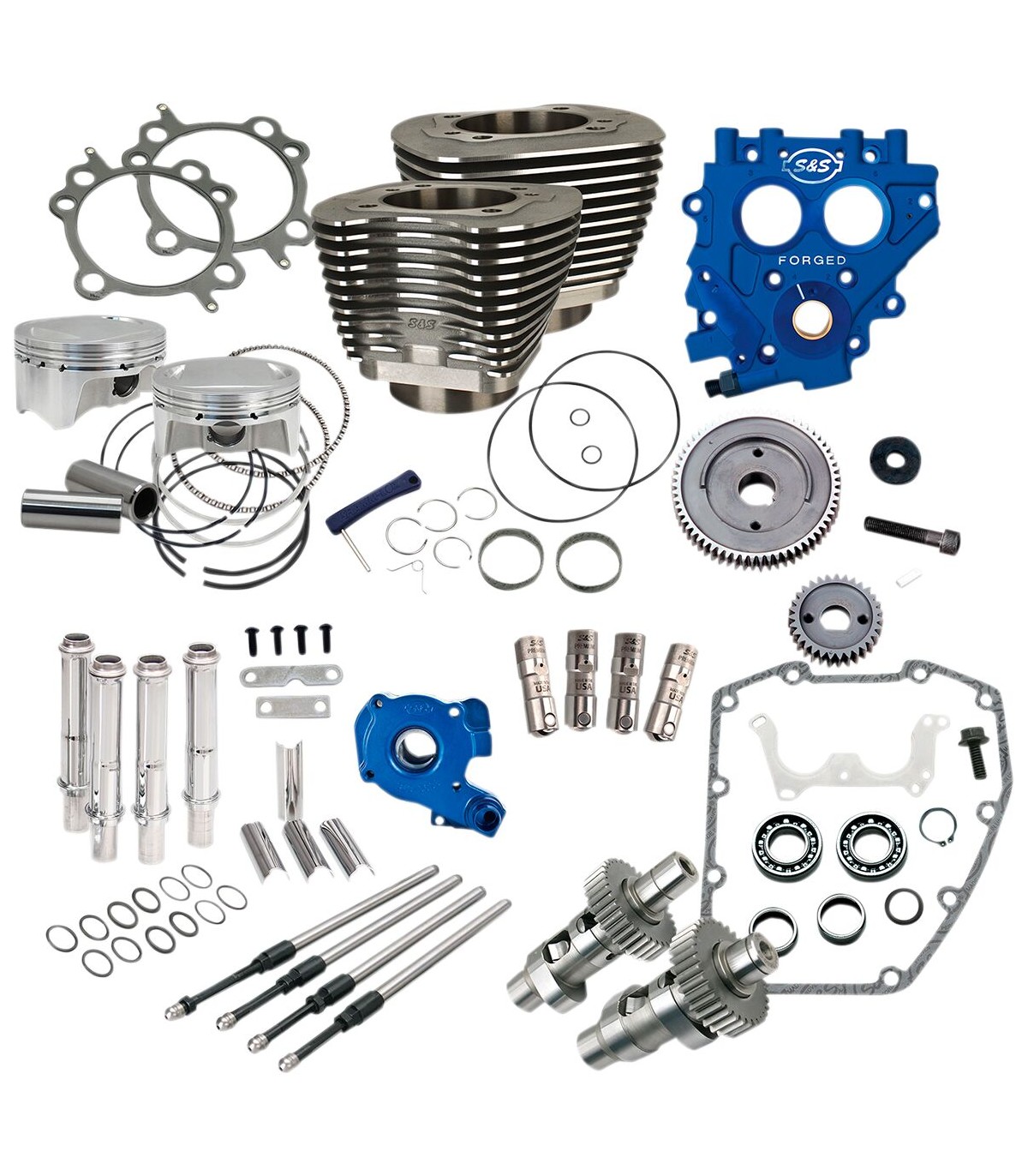 100" Power Package Engine Performance KitMade in the USAS&S 4.000" Big-Bore Cylinders, Piston Kits, S&S 585 Easy Start® Cams, S&S Quickee Pushrods, TC3 Cam Support Plate, TC3 Oil Pump, and Precision Hydraulic Tappets are included in this kitS&S Cylinder2x S&S 4.000" bore cylindersLow friction ductile cast iron linerBolt inNo maching, balancing, or splitting the crankcaseCan be used with stock headsIncrease displacement from 88 ci to 100 ciPiston Kit2x 4.000" pistons for front and rear2x 0.927" piston pins4x Piston pin clips with installation tool2x Ring packs which includes the top, second, oil rail and expander ringsProvides 10.5:1 compression ratioS&S 585 Easy Start® Cam SpecificationsIntake: Open 20° / Close 45° / Duration at 0.053" 245° / Valve Lift 0.585" Exhaust: Open 60° / Close 20° / Duration at 0.053" 260° / Valve Lift 0.585"S&S Quickee PushrodsAdjustable with chrome tubesTC3 Cam Support Plate and TC3 Oil PumpMachined from aluminum forgingsEnsures consistent oil pressure and engine longevityPrecision Hydraulic TappetsClose tolerances for low leak down ratesReduced valve train noise from start to shut downNot for '06 Dyna.Not compatible with S&S 79 cc Super Stock® heads.Not recommended for Tri-Glide or other three wheel models due to lugging nature of these bikes.'99-'04 Twin Cams will require the additional purchase of valve spring kit (sold separately).Pinion shaft runout must be less than .003" to use gear drive cams.