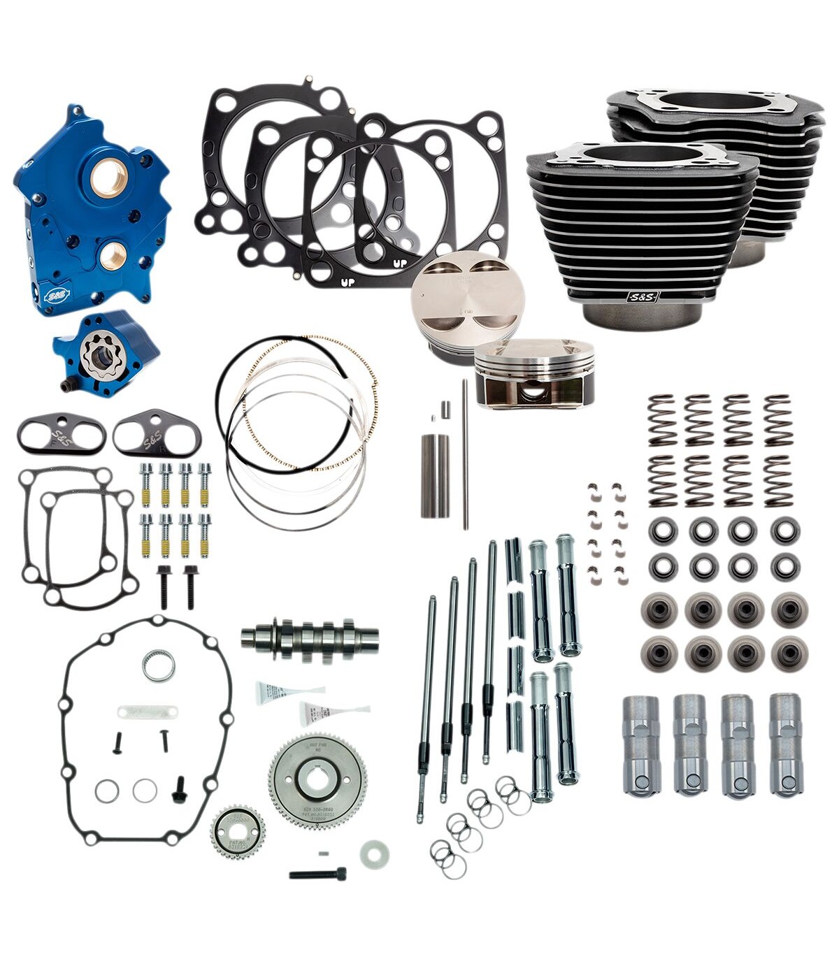 128" Power Package Engine Performance KitBig-bore bolt-on kit increases 114"/117" with 4-1/2" stroke M-Eight with no case machining required4-1/4" bore cylinders with 11:1 forged pistonsS&S oil pump/cam plate with blue anodized finishPassage plugs are removable for servicingIndependent scavenge sections for flywheel cavity and cam chestDebris screen in both scavenge pickupsMagnet in cam chest to help prevent debris from entering the oil pumpIncreased oil flow capacity on both the oil feed and scavenge sideAdjustable pressure relief valve can be adjusted with the unit installed in the engineQuickee pushrods with chrome pushrod tubesS&S premium tappetsS&S hard-anodized, black coated tappet cuffs are billet aluminum constructionImprove tappet stability in high-lift, high-rpm situationsS&S 550 cams designed for big bore applicationsS&S valve springs work with cams up to .605" liftHigh-performance conical single-wire spring designAll necessary gaskets, bearings, and hardware for bolt-on installation is includedMade in the U.S.A.Not recommended for Tri-Glide or other three wheel models including conversion due to lugging nature of these bikes.