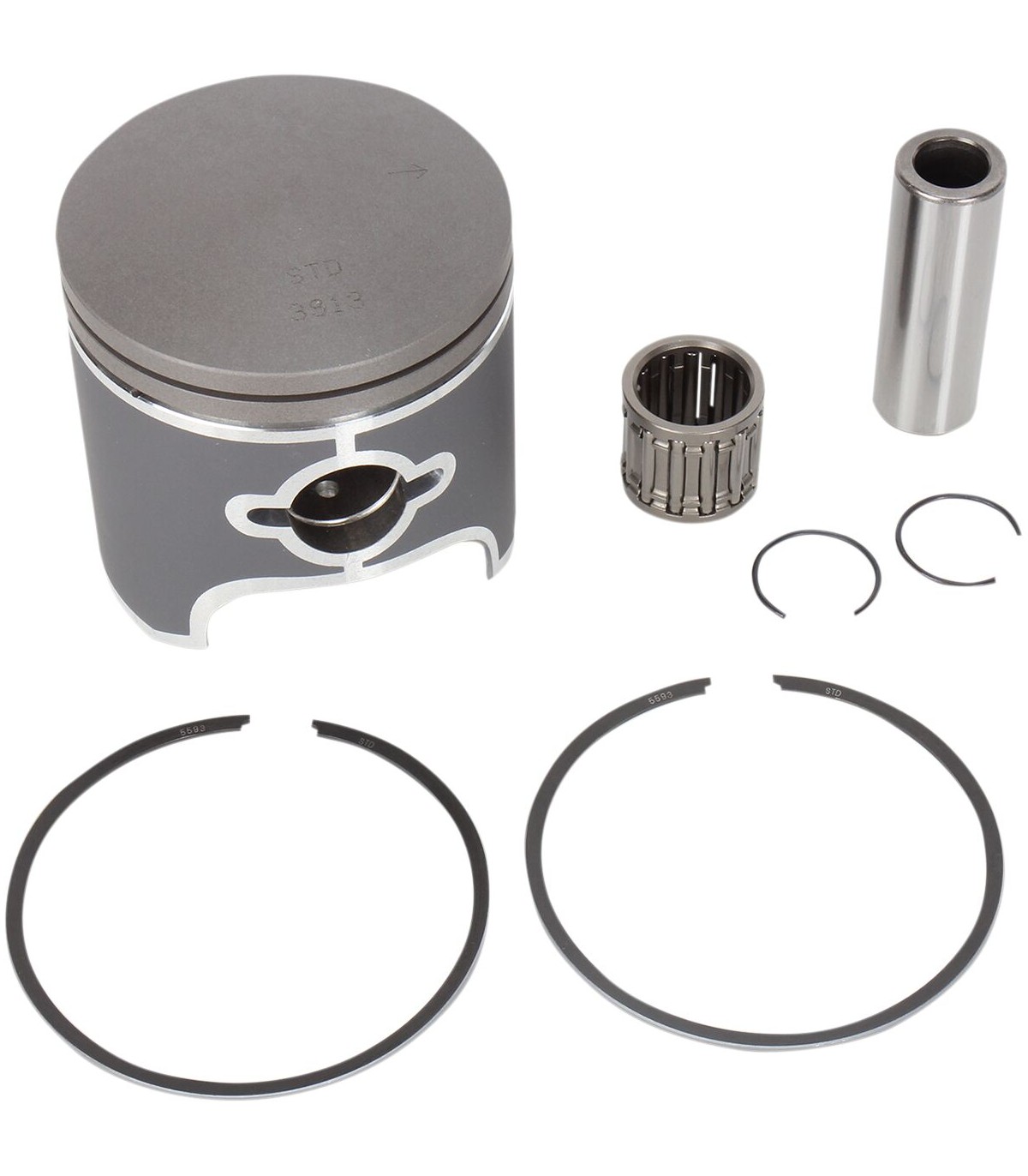 Kit de pistonPiston moulé de haute qualité, fabriqué avec un outillage et un moulage spécifiquesFabriqué d’un alliage hypereutectique pour plus de résistance et une expansion réduiteConstruction spéciale avec deux segments pour une meilleure stabilité et une résistance à l’usure amélioréeJupe complètement traitée MOS2 pour un rodage rapide et une meilleure protection anti-rayuresLe piston anodisé de forme convexe offre une bonne protection contre une chaleur excessiveUtilisation de segments de haute qualité comme par ex. Riken permettant un transfert de chaleur et un étanchéité de qualité optimaleDans une boîte contenant des pistons, segments, entretoise, circlips et roulement haut-moteur