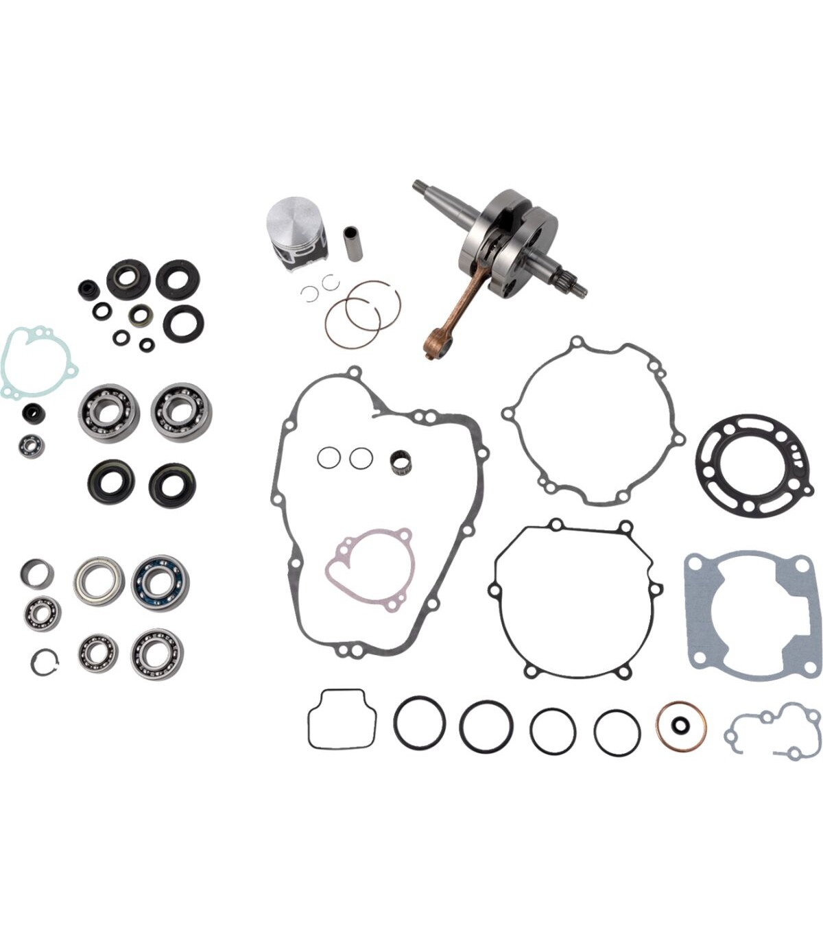 Complete Engine Rebuild Kit for 2-StrokeConvenient one-stop shop in a box; nearly all components required for a complete and professional rebuildVertex piston kit (standard compression piston, rings, pin and clips)Hot Rods heavy-duty crank (stock stroke with wrist pin bearing)Hot Rods main bearing/seal kitHot Rods transmission bearing kit (includes transmission bearings, output shaft collar and sprocket lock washer)Hot Rods counter balancer bearing kitHot Rods water pump bearing and seal kitVertex complete gaskets kit, including seals and O-ring kit (covers top and bottom)Kit Includes: