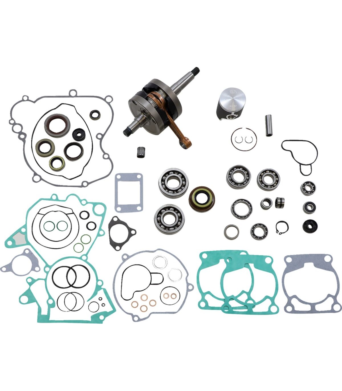 Complete Engine Rebuild Kit for 2-StrokeConvenient one-stop shop in a box; nearly all components required for a complete and professional rebuildVertex piston kit (standard compression piston, rings, pin and clips)Hot Rods heavy-duty crank (stock stroke with wrist pin bearing)Hot Rods main bearing/seal kitHot Rods transmission bearing kit (includes transmission bearings, output shaft collar and sprocket lock washer)Hot Rods counter balancer bearing kitHot Rods water pump bearing and seal kitVertex complete gaskets kit, including seals and O-ring kit (covers top and bottom)Kit Includes: • Crankshaft • Piston Kit • Complete Engine Gasket Kit • Oil Seal Kit • Main Bearing And Seal Kit • Water Pump Rebuild Kit • Transmission Bearing Kit • Countershaft/Seal Kit • Wrist Pin Bearing