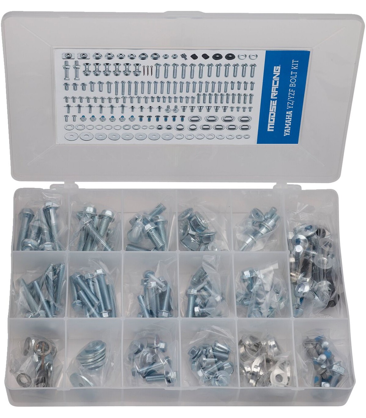 Kit de boulons M1 YZ/YZF/WRCe kit de 200 pièces comprend plusieurs pièces de matériel de montage, des boulon de couronne, des boulons de disque de frein, des pièces d’embout de valve, des écrous à bride, des boulons de remplacement, diverses rondelles et bien plusCes pièces peuvent également être employées sur des modèles anciens.