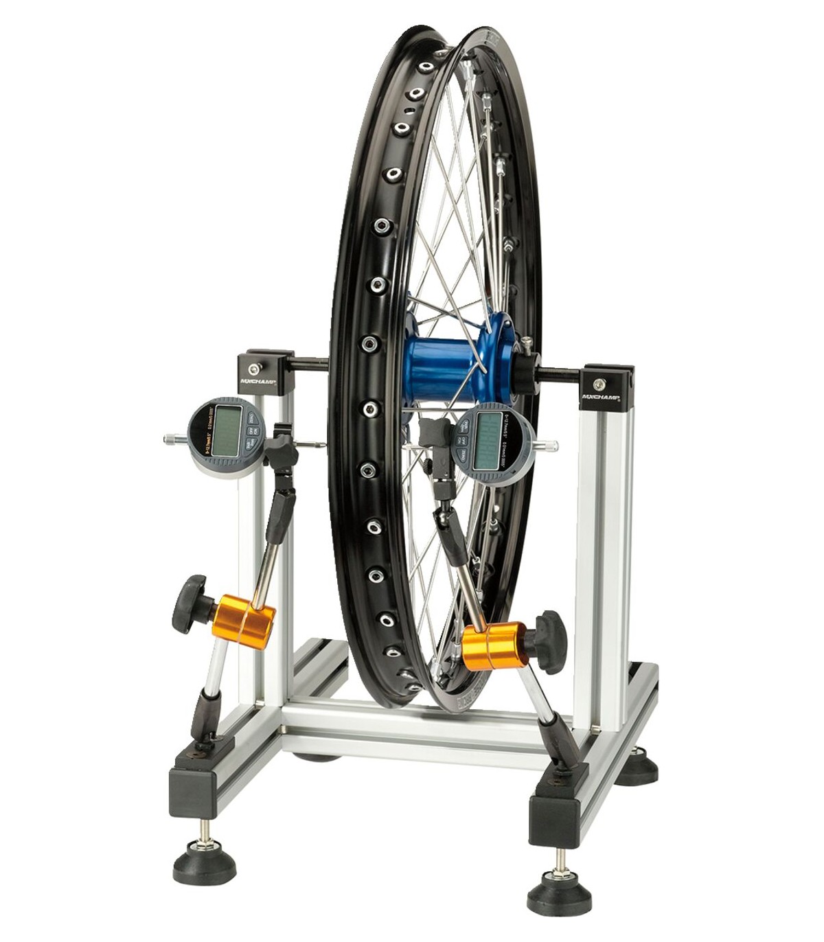 Professional Tire Wheel Truing StandIncludes two digital indicators to true side-to-side and up-down simultaneously—no more guessworkLightweight, yet rigid, aluminum frame and axel fits wheels from 16” - 21” with 20 mm - 30 mm axlesThreaded cones on axle keep wheel more secure than cones with index screwsStand's base has adjustable rubber feet to maintain level axleFlexible mounts fix indicators exactly where neededProfessional truing stand for more precise results