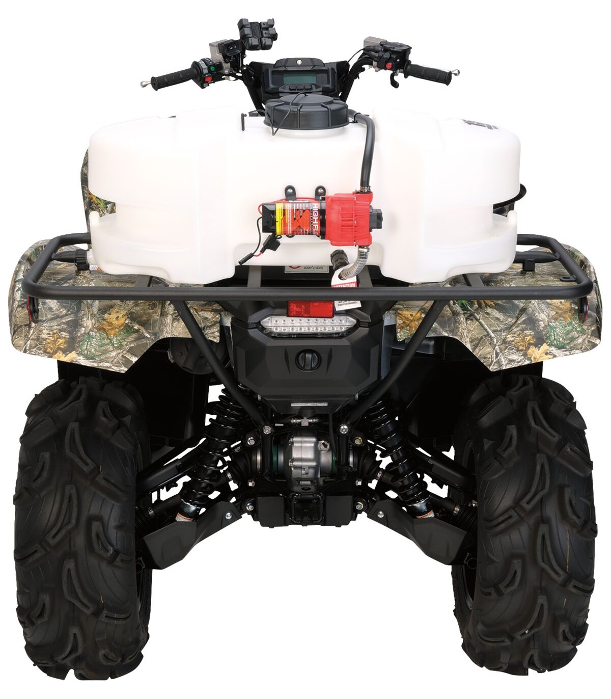 Kit de pulvérisateur de 15 gallonsRéservoir en polyéthylène résistant à la corrosion de 15 gallons (56,78 litres)Pompe à diaphragme haut débit de 12 V ; 1,0 GPM ; 35 psi (2,41 bar)Capacité de drainage complète avec point de sortie moulé, bouchon et attacheBouchon de remplissage de 5" (12,7 cm) avec attacheGrands crochets pour enrouler le tuyauIndicateurs en gallons et litres sur le réservoirClips pour pistolet moulésPistolet de 18" (45,72 cm) avec embout à faisceau ajustableTuyau de pistolet de 15’ (4,57 m)Pulvérisation horizontale maximale : 30’ (9,14 m)Pulvérisation verticale maximale : 18' (5,49 m)À utiliser avec sanglesAucune barre d'irrigation disponible pour ce modèleFabrication aux États-Unis.