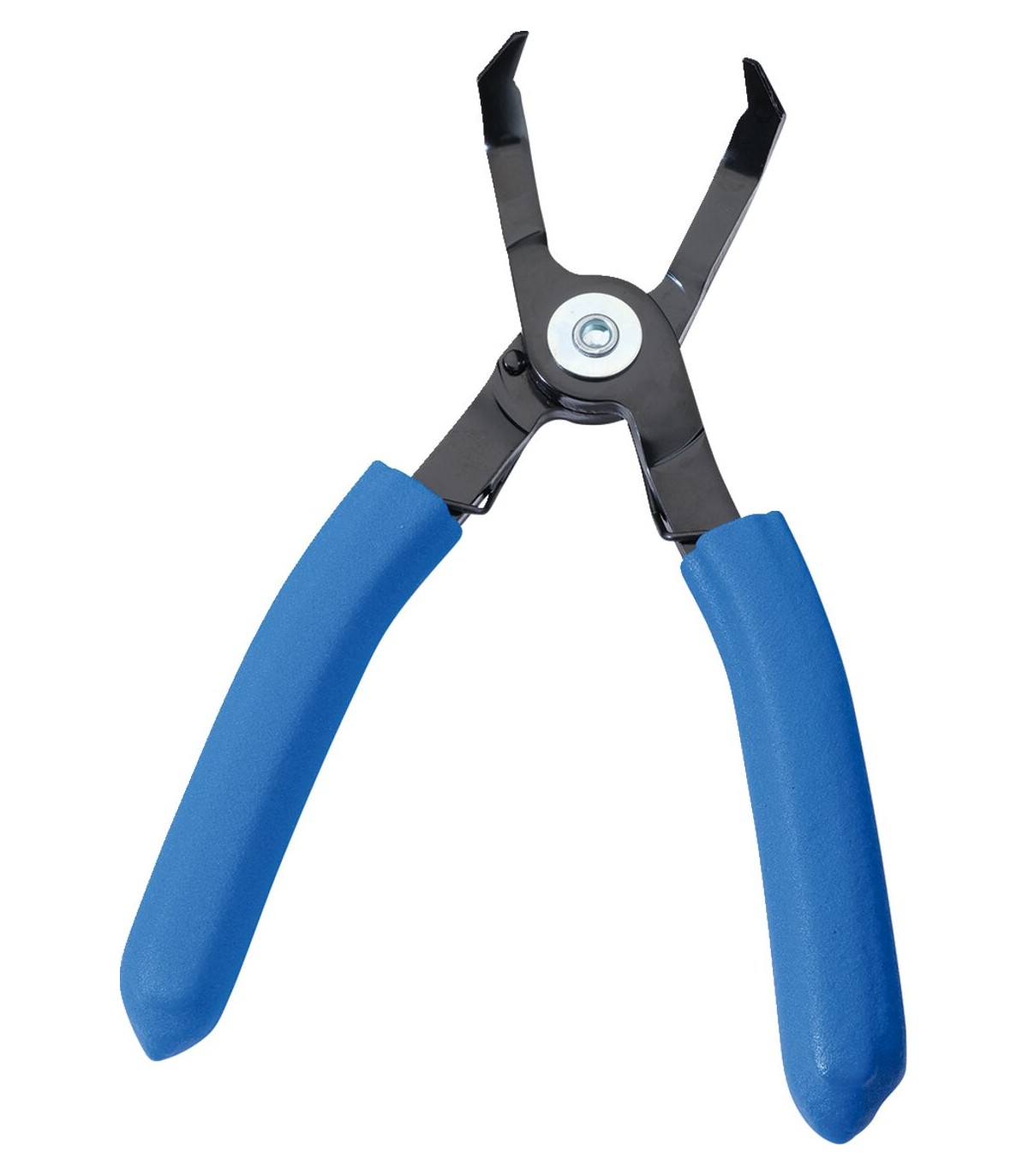 Pince pour rivets de carrosserieLes mâchoires, étroites et crochues, permettent de saisir et de retirer la tête en plastique sans difficulté.