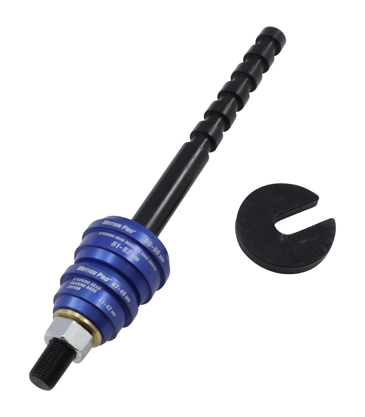 Steering Bearing InstallerFits tapered steering bearings 41-42 mm, 47-48 mm, 51-52 mm and 55-56 mmPrecision brass thrust bearing for increased durability and smooth operationWorks on all frames with head tube between 100 mm to 240 mm in lengthSafely installs tapered bearing races in motorcycles and ATV frameQuick adjustment slotted puller rod for quick installationLaser etched drivers for easy identificationInnovative double sided driversHardened steel