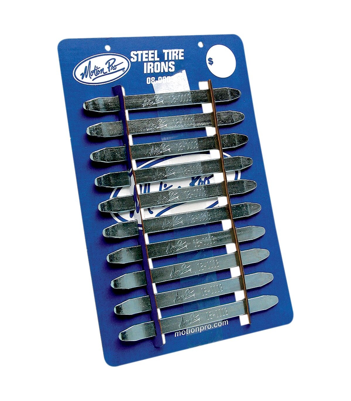 8-1/2" Tire Irons Card of 10Self service display card contains 10 individual levers8-1/2" is easy to carry and fits in most trail packsOne end is flat and other end is curvedHeat treated for strength and durabilityCold-forged steelIndividual levers are also sold separately (part# 08-0003).