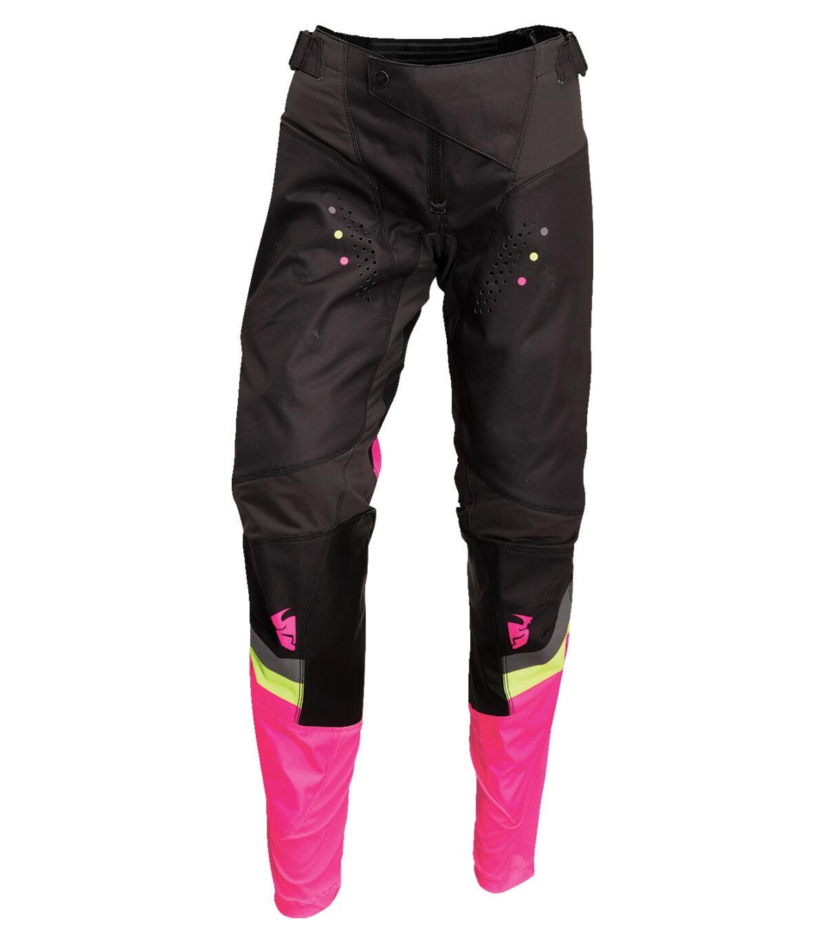 Women's Pulse Rev PantsDesigned to offer the optimal balance between mobility and durabilityPre-curved chassis design assumes active riding positionConstructed with 600D polyester in high wear zonesIn-Motion panels improve flexibility and durability throughoutDurable nylon saddle constructionFull grain leather inner knee panels for optimal grip and durabilityDurable stitching throughoutLaser cut ventilationMesh lower leg panelingDual side cinch system for precise waist adjustmentButton and zipper closureAthletic mesh comfort liner