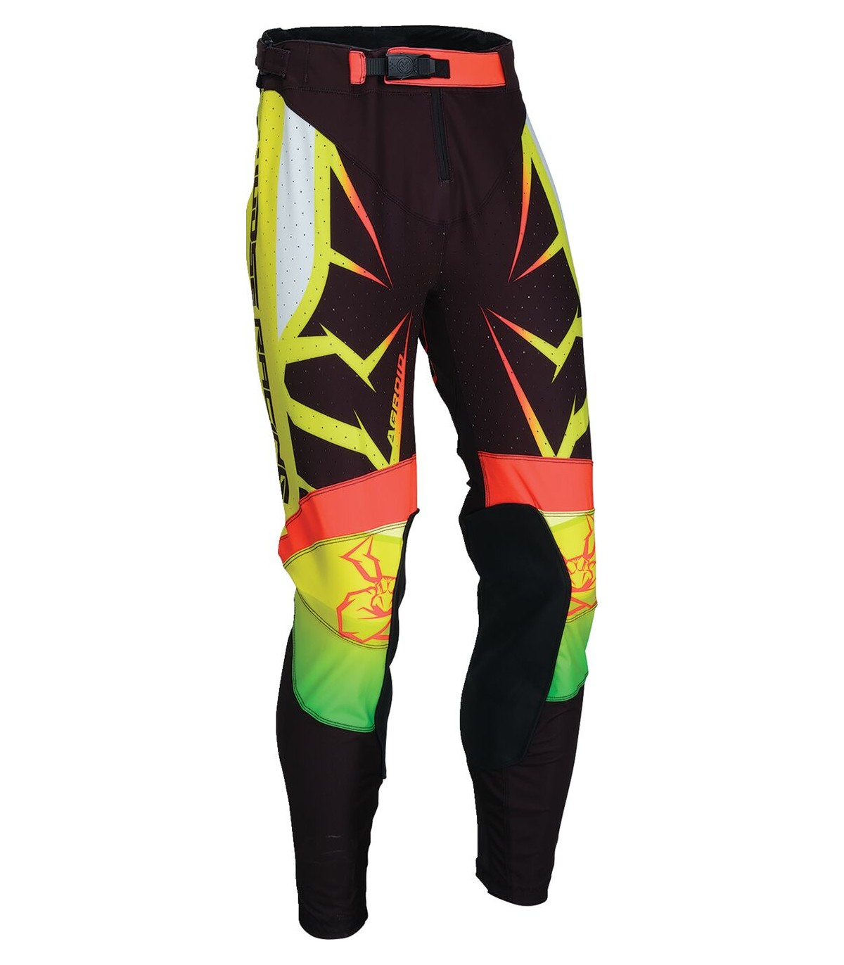 Agroid PantsPro-Rider testedLightweight, breathable stretch polyester woven chassisPerforated leg panels for ventilationPre-curved leg for ergonomic riding positionDurable stretch rip-stop seat and kneeFull grain leather inner knee panelsSlim fit over knee braces or guards3-point waist adjustment systemNon-fading sublimated graphicsYKK® Auto-Locking zipper