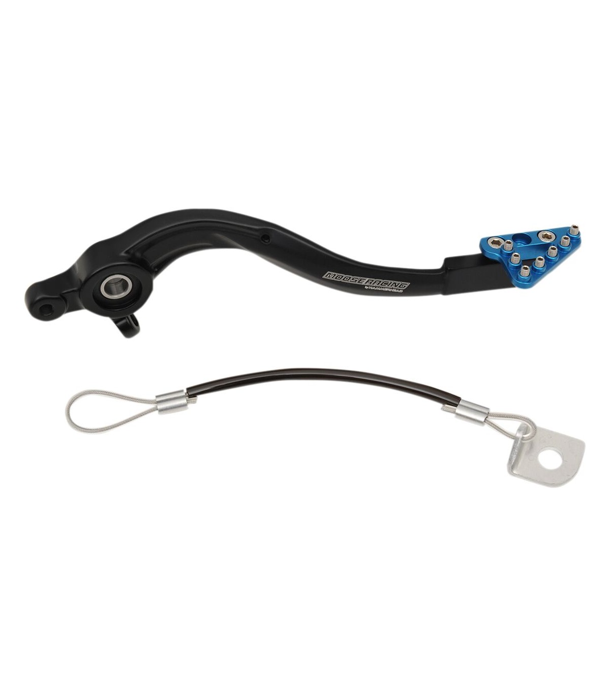 Pédale de freinMoose Racing s'est associé à Hammerhead pour vous offrir la pédale de frein ultimeLes bras de la pédale de frein sont forgés à partir d’aluminium taillé dans la masse 6061 avec axes de chape de frein en acier inoxydable et douilles de pivot en laiton.L'extrémité de frein finement usinée CNC est dotée d'un jeu de vis en acier inoxydable pour améliorer sa durée de vie et son adhérenceLes embouts des pédales de frein peuvent être ajustés dans deux positions de montage dans le sens de la longueur et sont connectés à l'aide de vis 6 pans en acier inoxydableLe bras de pédale de frein anodisé est en noir mat, tandis que les embouts sont anodisés et peints dans des couleurs différentes selon la marque de la motoChaque pédale de frein est dotée d'un câble de maintien en acier inoxydablePièce anodisée et dotée d'une protection UV pour conserver sa couleurFabrication aux États-Unis