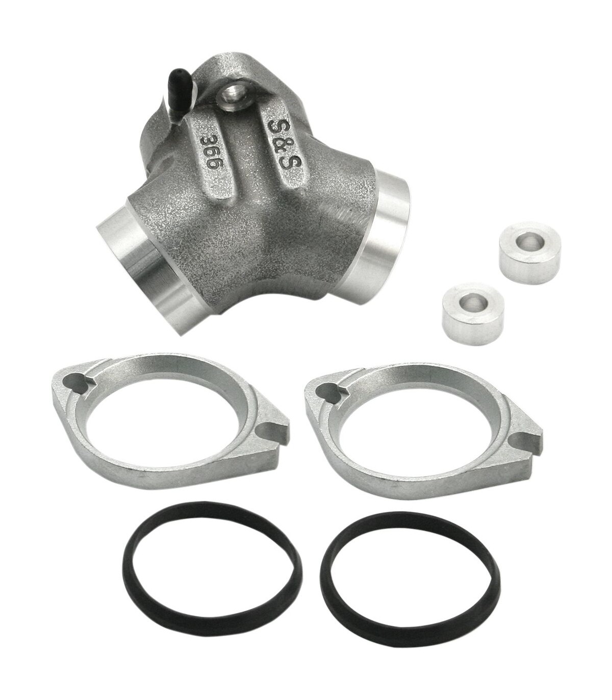 Manifold Conversion KitIncludes front and rear manifold mounting flanges, manifold O-rings and aluminum spacer shimsReplaces original rubber manifoldSize 341 fits 4.65" cylindersNatural finishMade in the USAFor use with S&S A/B/E, Tillotson, Bendix and Keihin butterfly carburetors.