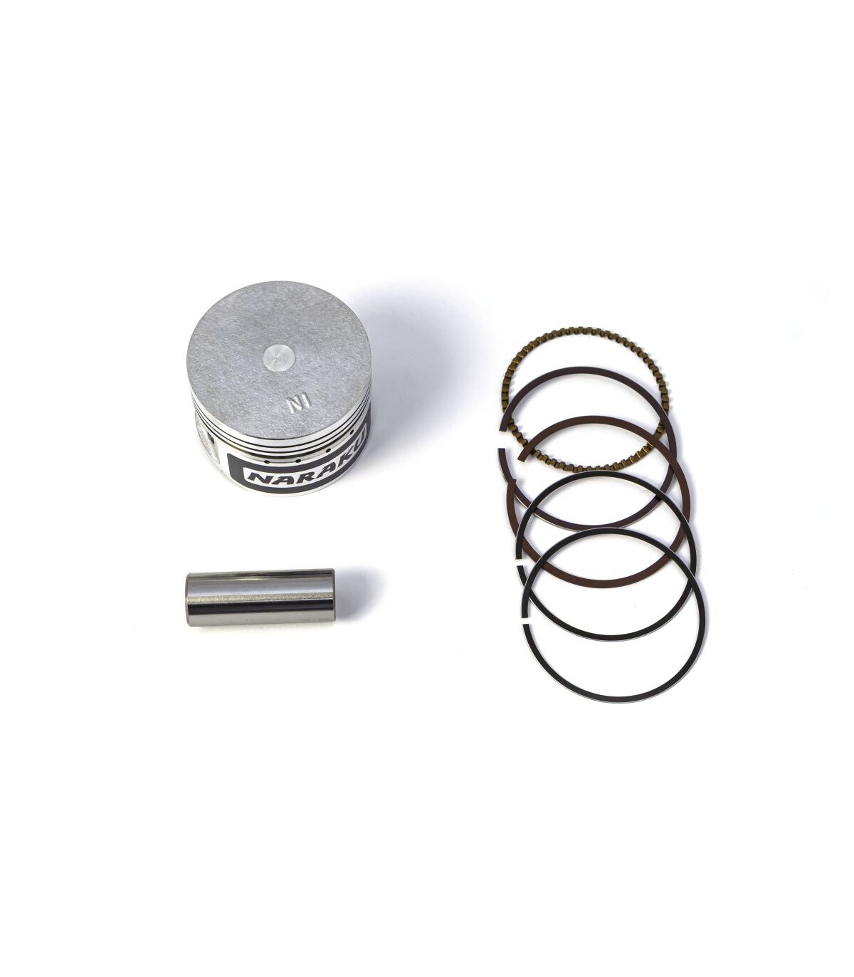 Piston KitNARAKU performance quality piston setThe NARAKU piston has a molybdenum coating to reduce wear and shorten the running-in periodThe CNC-machined grooves in the piston skirt ensure continual lubricationPiston kit comes complete with rings, oil scraper rings, gudgeon pin and circlipsNaraku piston kit [63mm / 180cc] 4-stroke