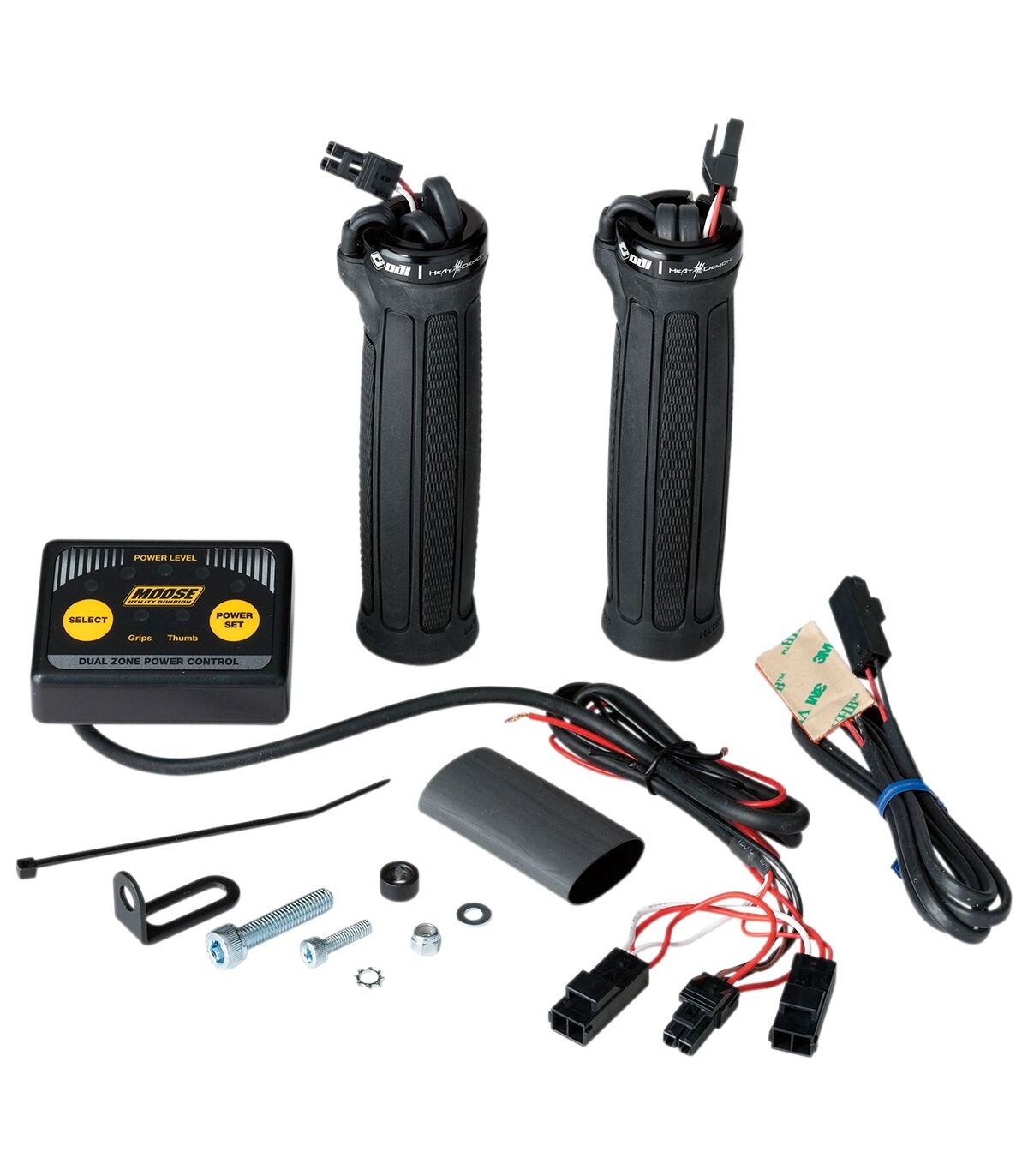 Kit de poignées chauffantes avec module Dual Zone rapides à installer pour quadsDeux poignées chauffantes à collier – design remanié compatible avec la plupart des modèles de quadChauffe-pouce en silicon adhésifContrôleur double zone – sélectionnez le degré de chauffage du pouce et de la poignée séparémentCinq niveaux de température prédéfinisPoignées – maximum 40 watts (20 watts par poignée) à 14 voltsChauffe-pouce – maximum 5 watts à 14 volts