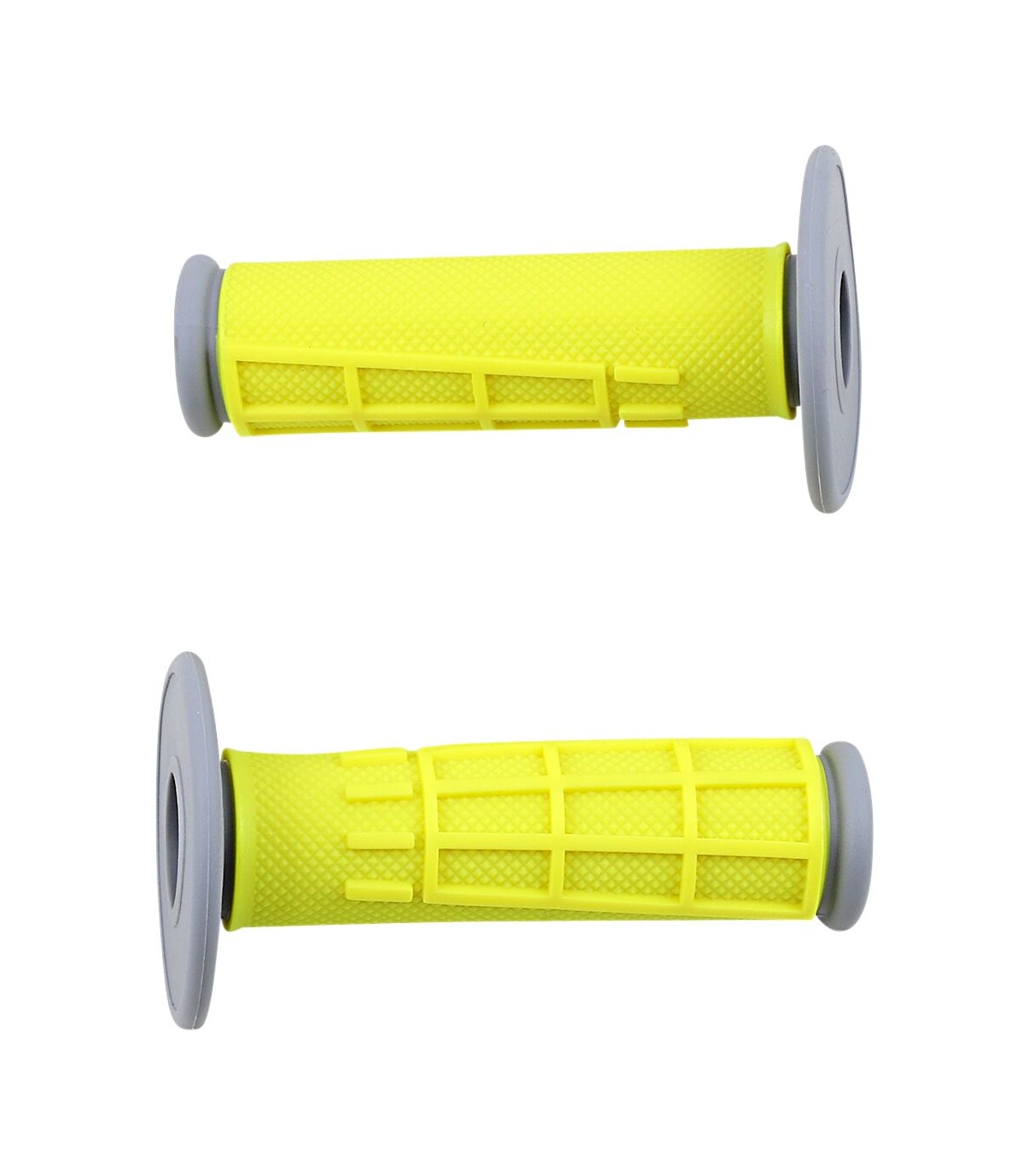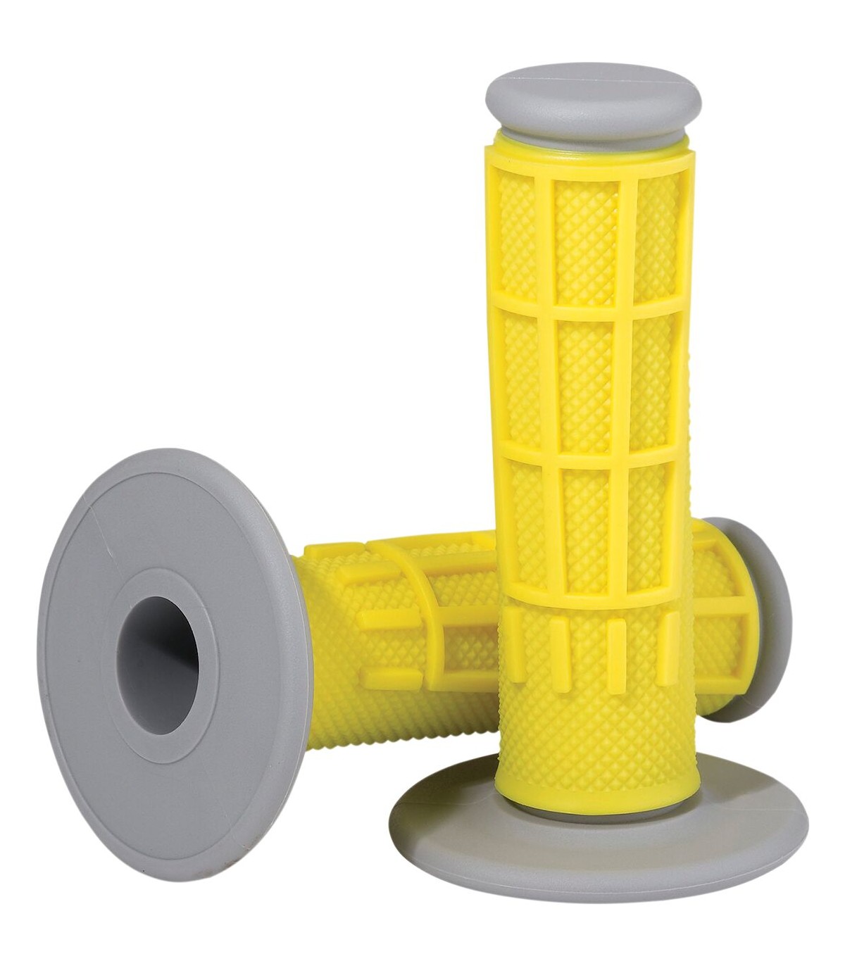 Poignées semi-gaufrées Comp DiamondPoignées à double composéComposé ferme utilisé pour la bride interne et externe, pour plus de robustesseComposé doux pour la paume et les doigts pour ajouter de l’accroche et du confort pendant la conduiteLe motif semi-gaufré assure une adhérence supplémentaire et la base de la poignée a des motifs diamants pour apporter de la traction en présence d’humidité et de boueLa forme conique du motif semi-gaufré confère à la poignée un design plus finConçu pour une utilisation sur guidons de moto avec barre de 7/8’’ de diamètre et accélérateur rotatif avec tube d'accélérateur