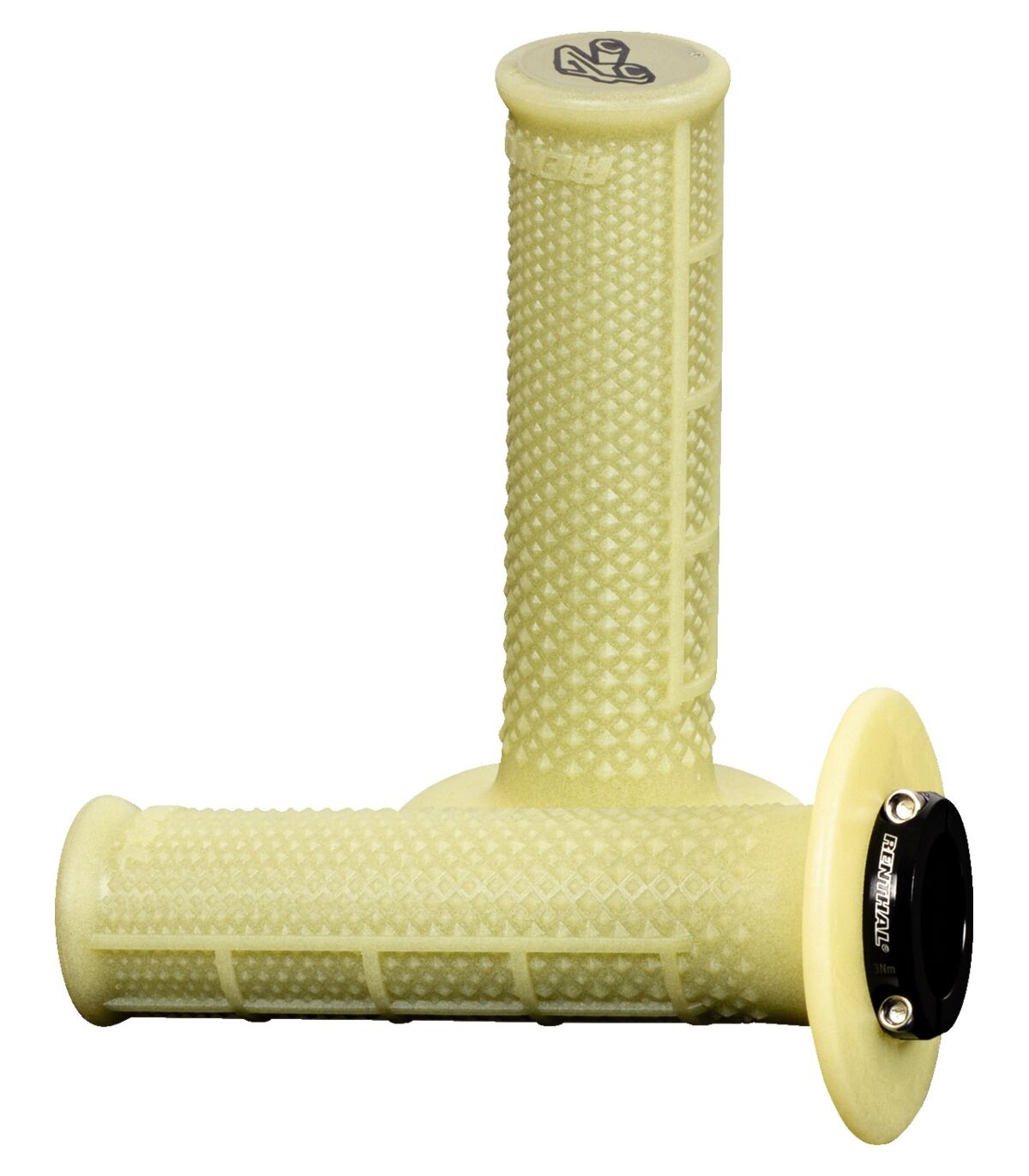 MX R-Works Lock-On GripsLock-on grip is fit for installation on any aftermarket handlebar without the need for modification while retaining full clamping forceTwin split collar design means you are able to slide the clutch side grip over any knurled MX handlebars without any sanding or modification, ensuring the clamp is permanently bonded to the gripEach pair of grips comes with a set of 6 throttle cams; cams cleanly snap on with a simple press fitment design and provide smooth throttle actionTuff-End Tech provides 4 mm thick solid plastic end caps with a premium and vibrant Renthal ‘R’ logo to minimize damage that can incur during a crash or tip over, allowing you to finish your ride or race without failure
