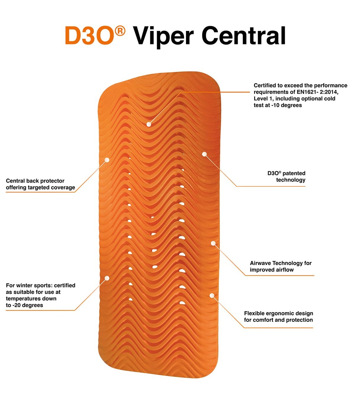 D3O® Viper Central Back Impact ProtectorExtremely flexible, low profile and lightweightAirwave technology for improved airflowFor winter sports: certified as suitable for use at temperatures down to -20°13 mm thicknessBack protector EN 1621-1:2014 Level 1.Dimensions — 400 mm x 165 mm