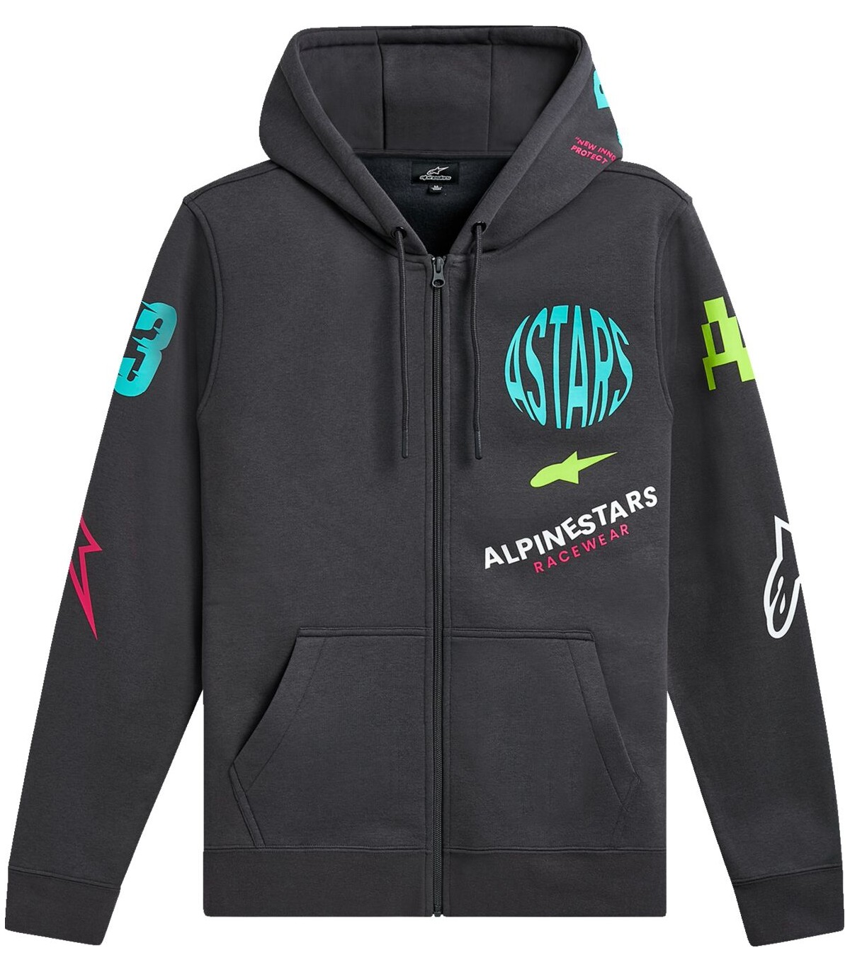Variegate Zip Hoodie80% Cotton / 20% Recycled PolyesterMulti logo art at front, sleeves, back, and hoodZip hoodie with kangaroo pocketSelf lined hood, dipped drawcord tips, rib cuffs and hemInternal main label and external label branding