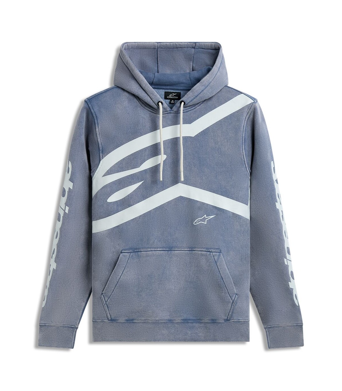 Unbound HoodieGarment dye pull over fleece hoodie with kangaroo pocket.Extra large logo on front and alpinestars words on sleeves.Self lined hood, dipped drawcord tips, rib cuffs and hem.Internal main label and external label branding.80% Cotton & 20% Recycled Polyester