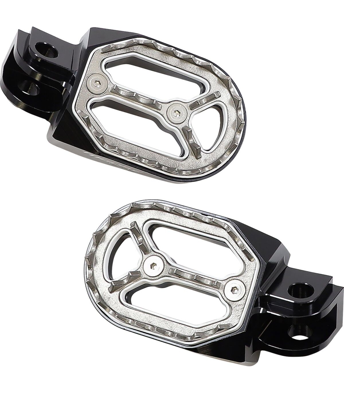 Repose-pieds QualifierRepose-pied en deux parties au design légerAlliage d'aluminium usiné CNCPlateau repose-pied extrêmement large en acier inoxydable pouvant être remplacé et offrant au pilote une adhérence ultimeLe plateau repose-pied en acier inoxydable est en outre intégré à un amortisseur en caoutchouc qui amortit les chocsUtilisent les ressorts d'origine