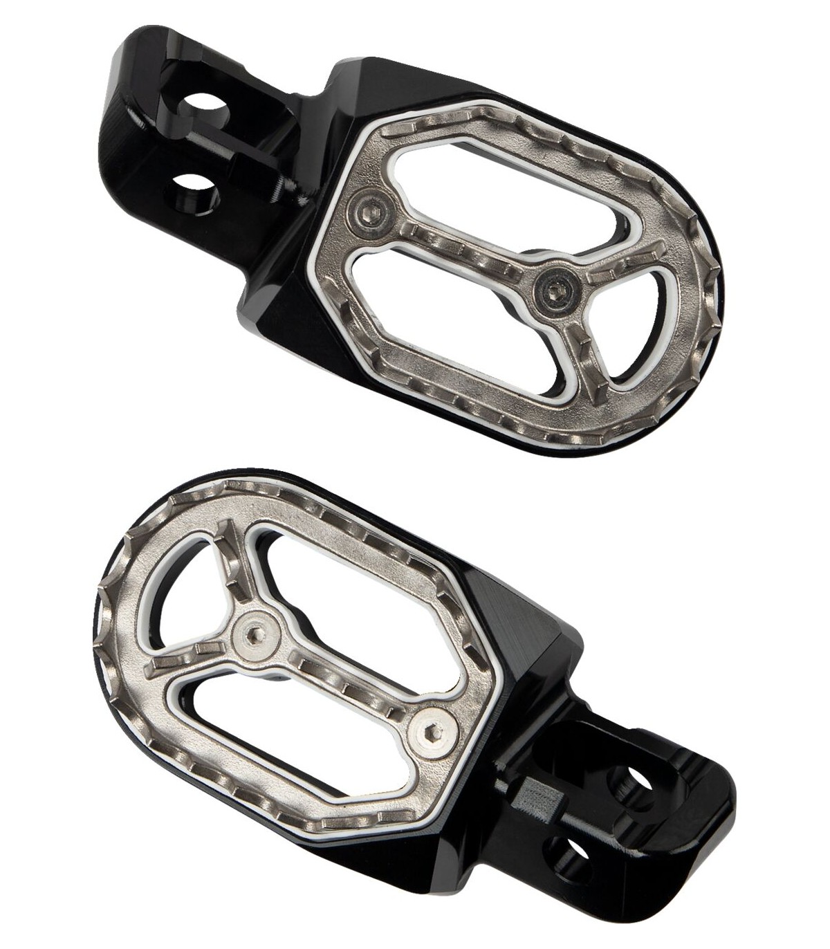 Repose-pieds QualifierRepose-pied en deux parties au design légerAlliage d'aluminium usiné CNCPlateau repose-pied extrêmement large en acier inoxydable pouvant être remplacé et offrant au pilote une adhérence ultimeLe plateau repose-pied en acier inoxydable est en outre intégré à un amortisseur en caoutchouc qui amortit les chocsUtilisent les ressorts d'origine