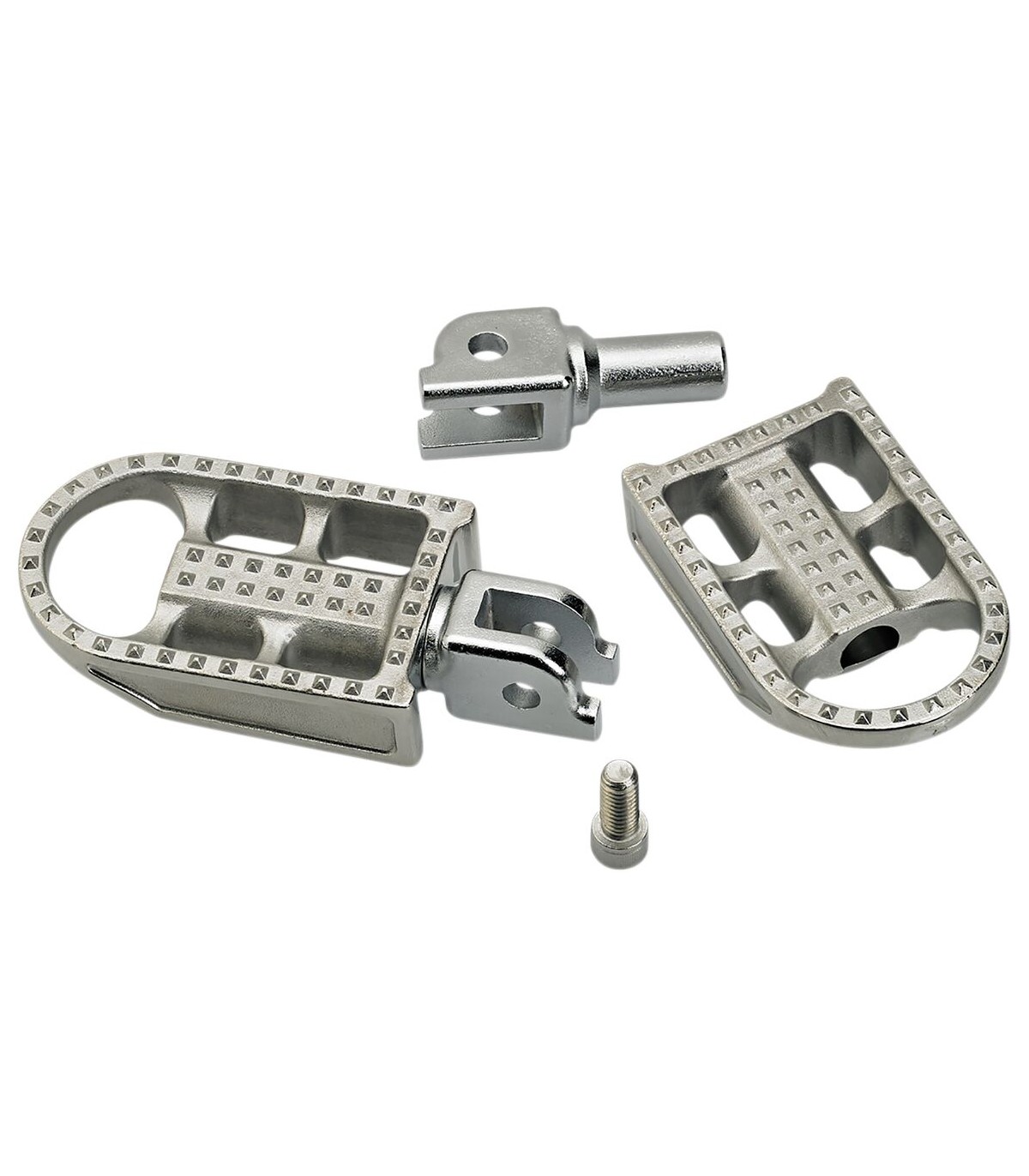 Mushman FootpegsJust like the Sanderson footpegs, these feature investment-cast stainless steel constructionEach peg attaches with a single Allen cap screw to an infinitely adjustable cast chromoly clevisRiders can easily fine-tune the angle of the textured surface relative to the bottom of their bootsPegs measure 2-1/8" wide by 3-1/2" long
