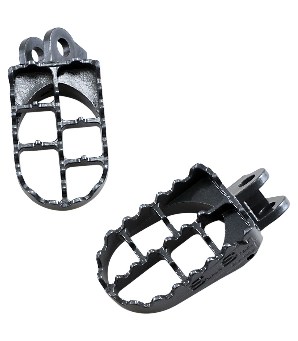 Super-Stock FootpegsWider than stock for sure-footed comfortCast from stainless steel - not weldedSerrated for positive footing, but points are rounded for safety
