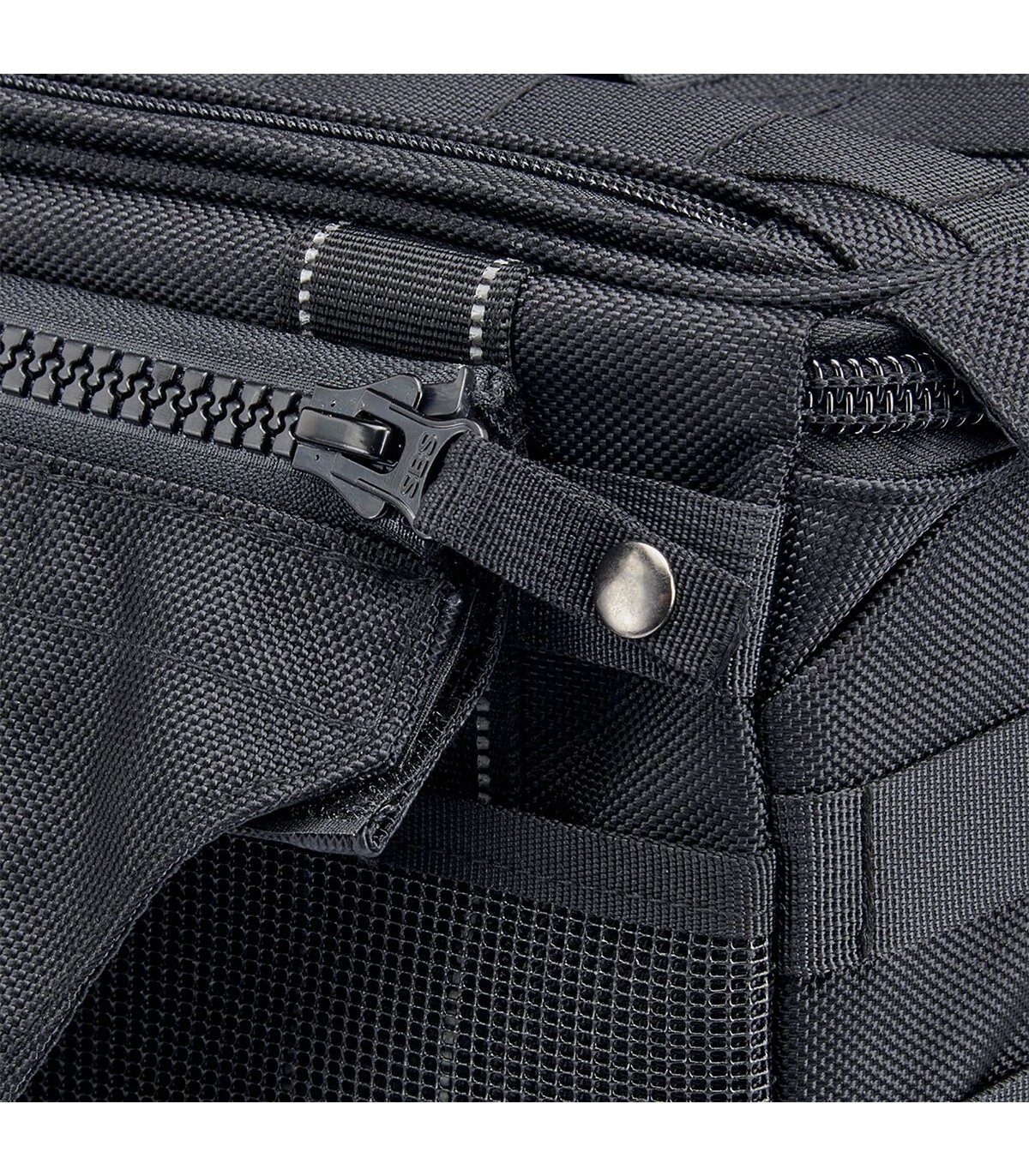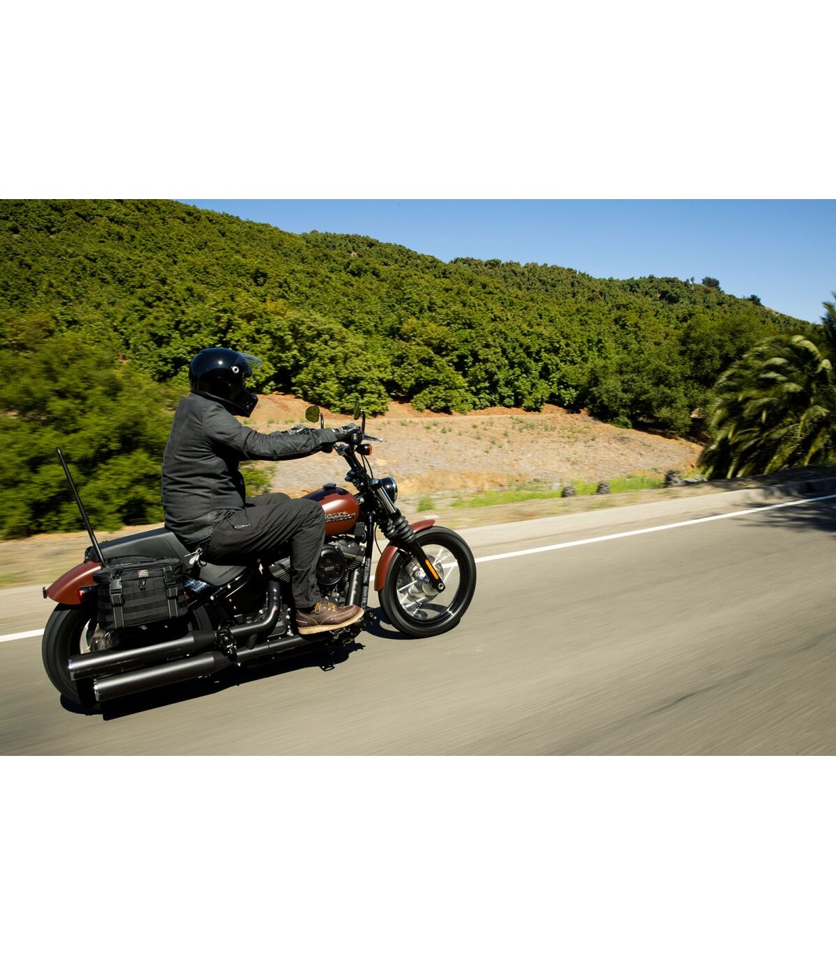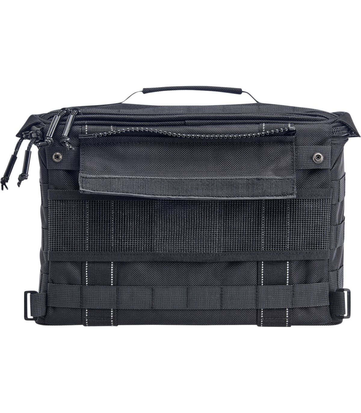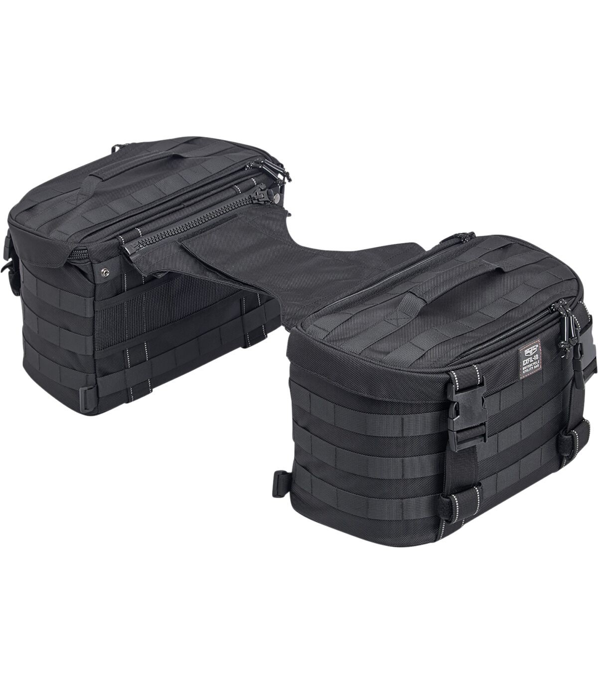 EXFIL-18 SaddlebagsUV-treated 1680-denier ballistic nylon exterior resists moisture and fading Strong, flexible EVA foam panels inside main compartment add structure and durabilityMOLLE system on exterior provides options for attaching accessories and extra gear One main and two secondary compartments are secured with rustproof nylon zippersZippered clamshell cover on main compartment locks closed with two 1.5-inch wide (36mm) reflective polyester straps and Duraflex quick-release buckles High-vis orange interior lining makes spotting contents easier10” wide x 8” deep (254mm x 203mm) zippered pocket on clamshell top provides fast access to maps, smart phones, and other essentials Two-piece mounting yoke with adjustable hook and loop panel fastens to both bags with extra-large, heavy-duty nylon zippersUniversal fit works with a variety of aftermarket saddlebag supportsMultiple D-rings and MOLLE points on bag exterior provide options for carabiners/bungee cordsHidden cable port into main compartment—perfect for charging devices Waterproof nylon rain covers with elastic gathers and drawstring closure provide extra protection in extreme conditions