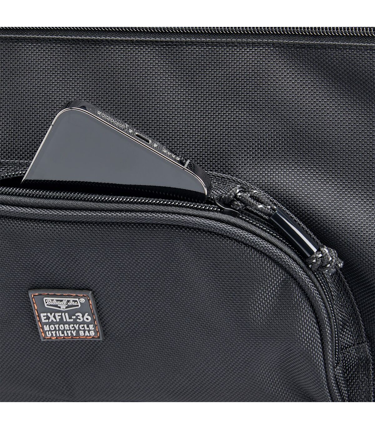 EXFIL-36 SaddlebagsEngineered for easy installation and universal fit on a wide range of motorcyclesUV-treated 1680-denier ballistic nylon exterior resists moisture and fadingStrong, flexible EVA foam panels inside main compartment add structure and durabilityPVC-treated waterproof security flap over main compartment closes with 1.5-inch wide (36mm) reflective polyester straps and Duraflex quick-release bucklesExtra-large 15” long x 7” wide PVC-treated main compartment door features double zippers with single paracord pull for speedy operationMOLLE system on exterior provides options for attaching accessories and extra gearTwo-piece mounting yoke with adjustable hook and loop panel fastens to both bags with heavy-duty nylon zippersBag bottoms reinforced with heat-resistant, heavyweight canvas panelsMain compartment features three elastic mesh pockets and one vertical pocket Adjustable straps inside main compartment to secure rolled clothing, fuel bottle, or other gearMesh document pocket with two zippers inside waterproof security flapHigh-vis orange interior lining makes spotting contents easierHidden cable port into main compartment—perfect for charging devices 15.25” wide x 7.25” deep (388mm x 184mm) exterior pocket beneath security flap for documents and small essentials 9” wide x 4.5” tall (240mm x 114mm) clamshell pocket with double zipper pulls beneath security flap is accessible without opening the main compartmentDouble-sided straps included for securing bag to appropriate mounting points on motorcycleUniversal fit works with a variety of aftermarket saddlebag supportsMultiple D-rings, MOLLE points, and high-strength nylon loops on exterior provide options for carabiners/bungee cordsHand-sewn seams with high-strength polyester thread Waterproof nylon rain covers with elastic gathers and drawstring closure provide extra protection in extreme conditions