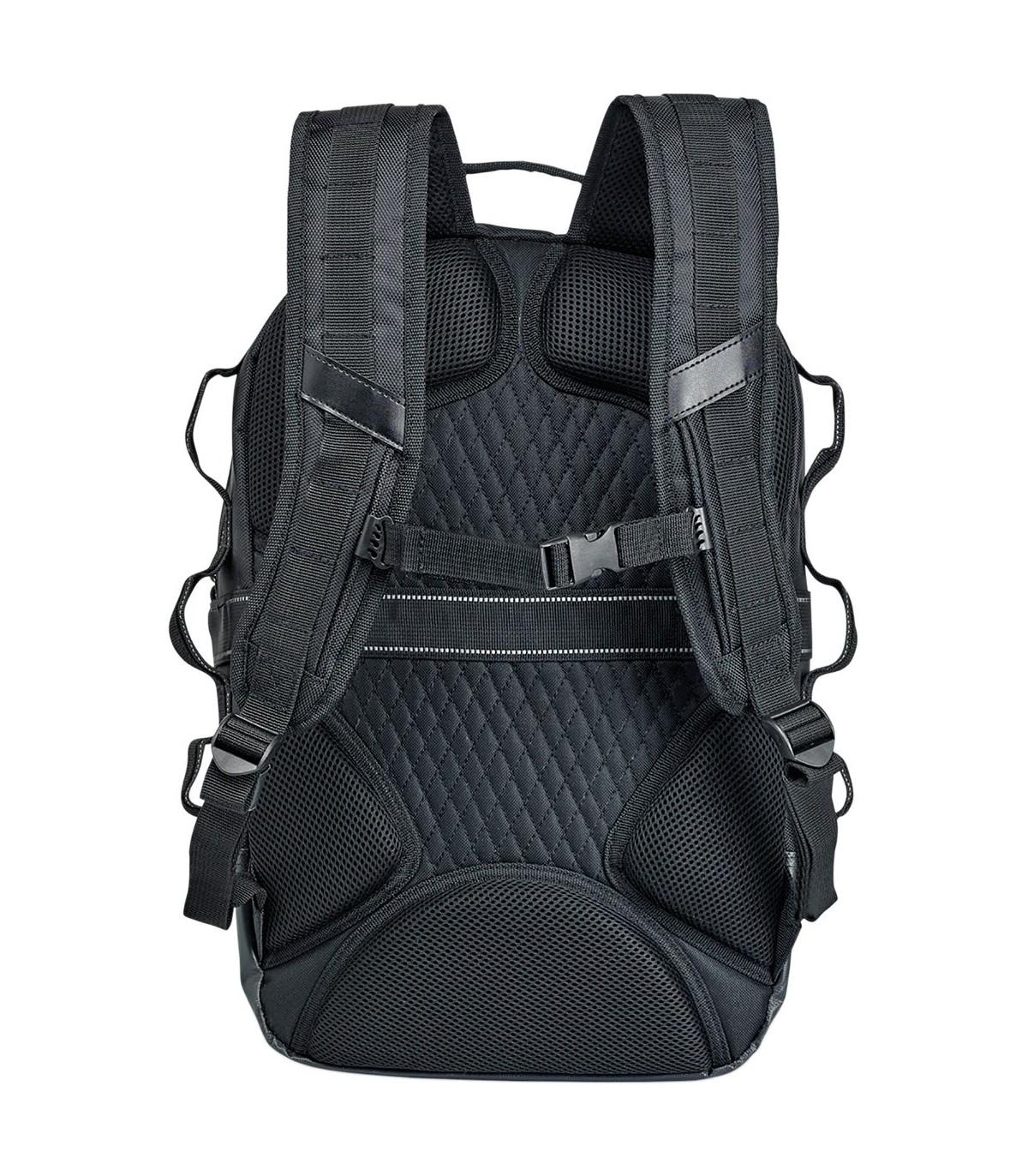 EXFIL-48 Backpack1680 denier ballistic nylon outer chassis with PVC coating outer shellPVC-treated heavy-duty bottom and lower side panels resist water and dirtPadded laptop sleeve with elastic retainers in the main compartmentUpper exterior compartment features a zipper pouch for keys and incidentalsMolded nylon buckles on cinch straps for speedy mounting on sissy barsExternal straps can be used to add a bedroll, jacket or skateboard to the bag6 heavy-duty, bar-tacked lashing points for loading and mounting optionsPadded shoulder straps and BioFoam back with ventilated panels for airflow and comfortHolds 48 - 12oz cans